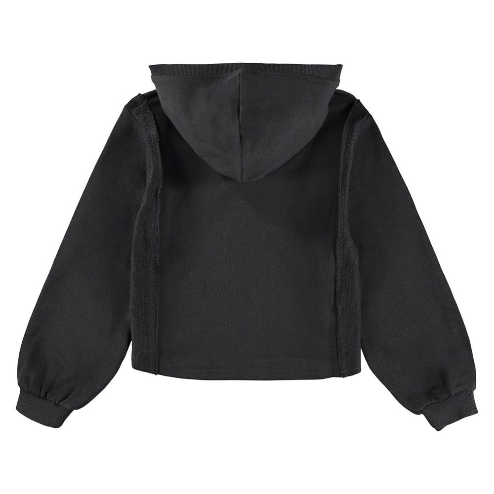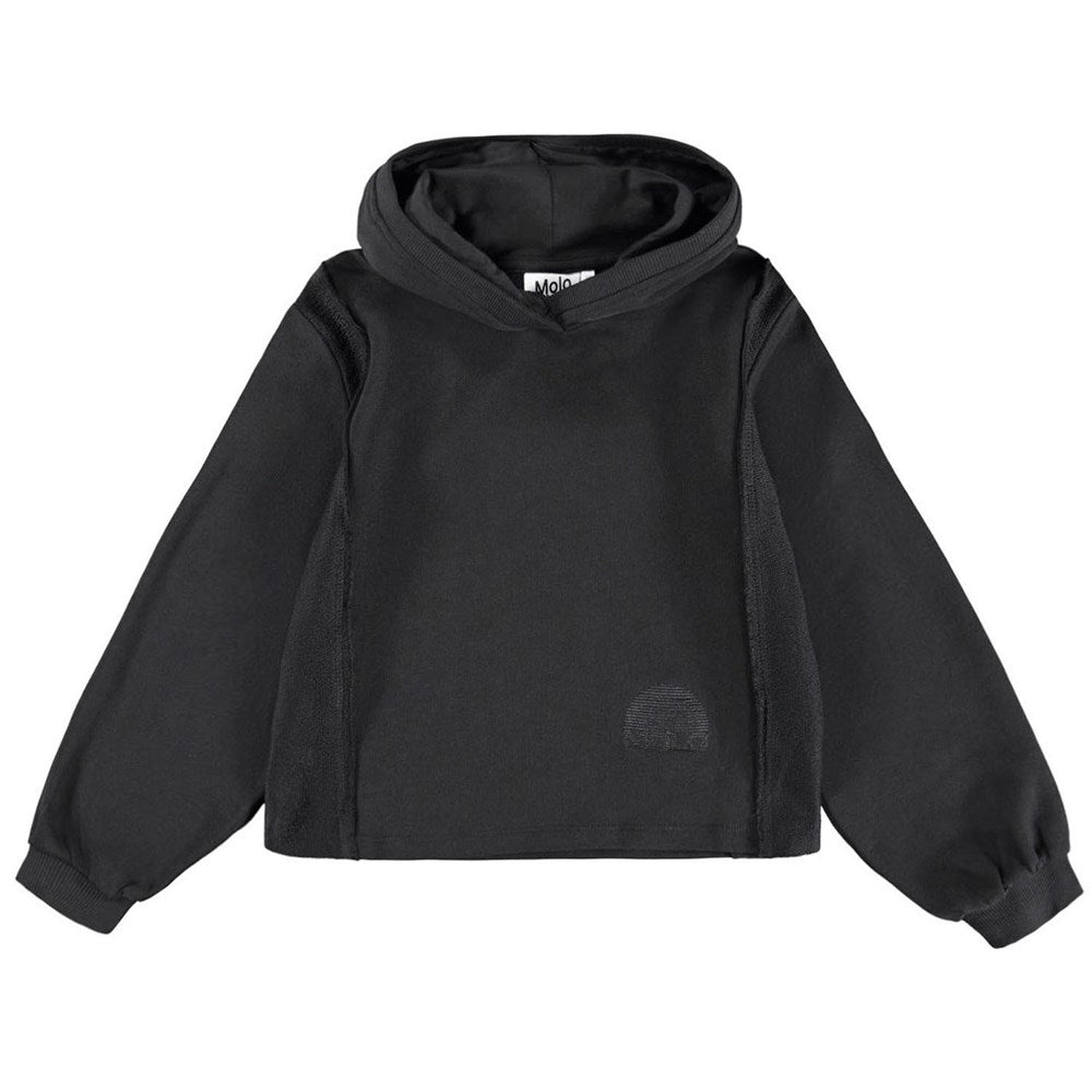 Svört, víð hettupeysa frá Molo með stórum opnum vasa að framan.