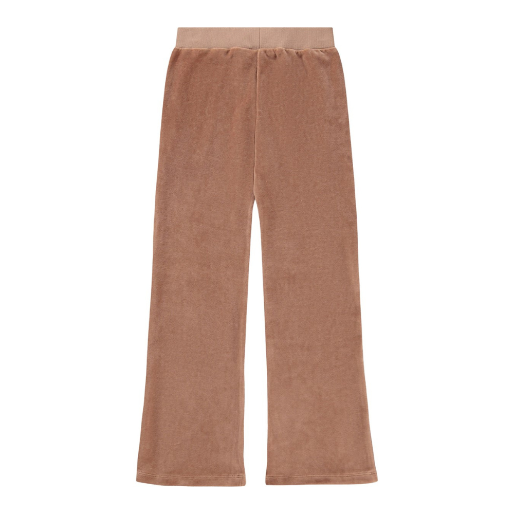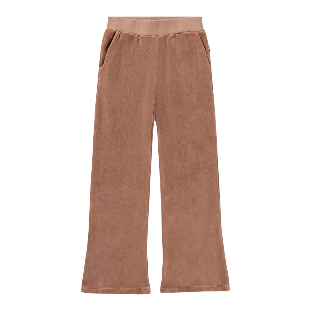 Brúnar, útvíðar velour buxur frá Molo með teygju í mittð.