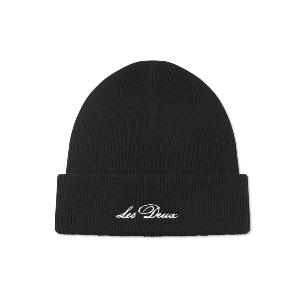 Svört húfa frá Les Deux með uppábroti og útsaumuðu logo að framan.