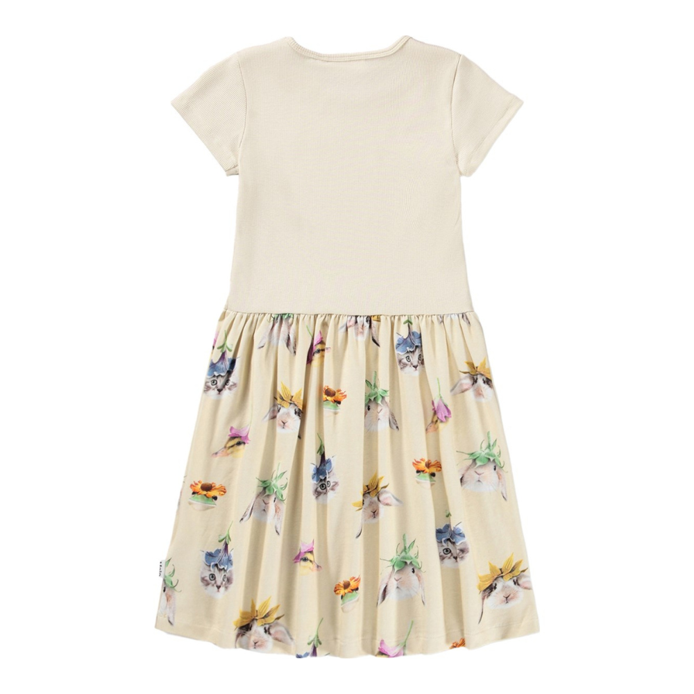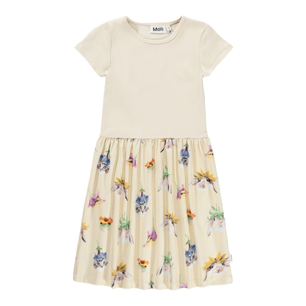 Ljós Molo kjóll með stuttum ermum, einlitum efri part og mynstruðu pilsi.