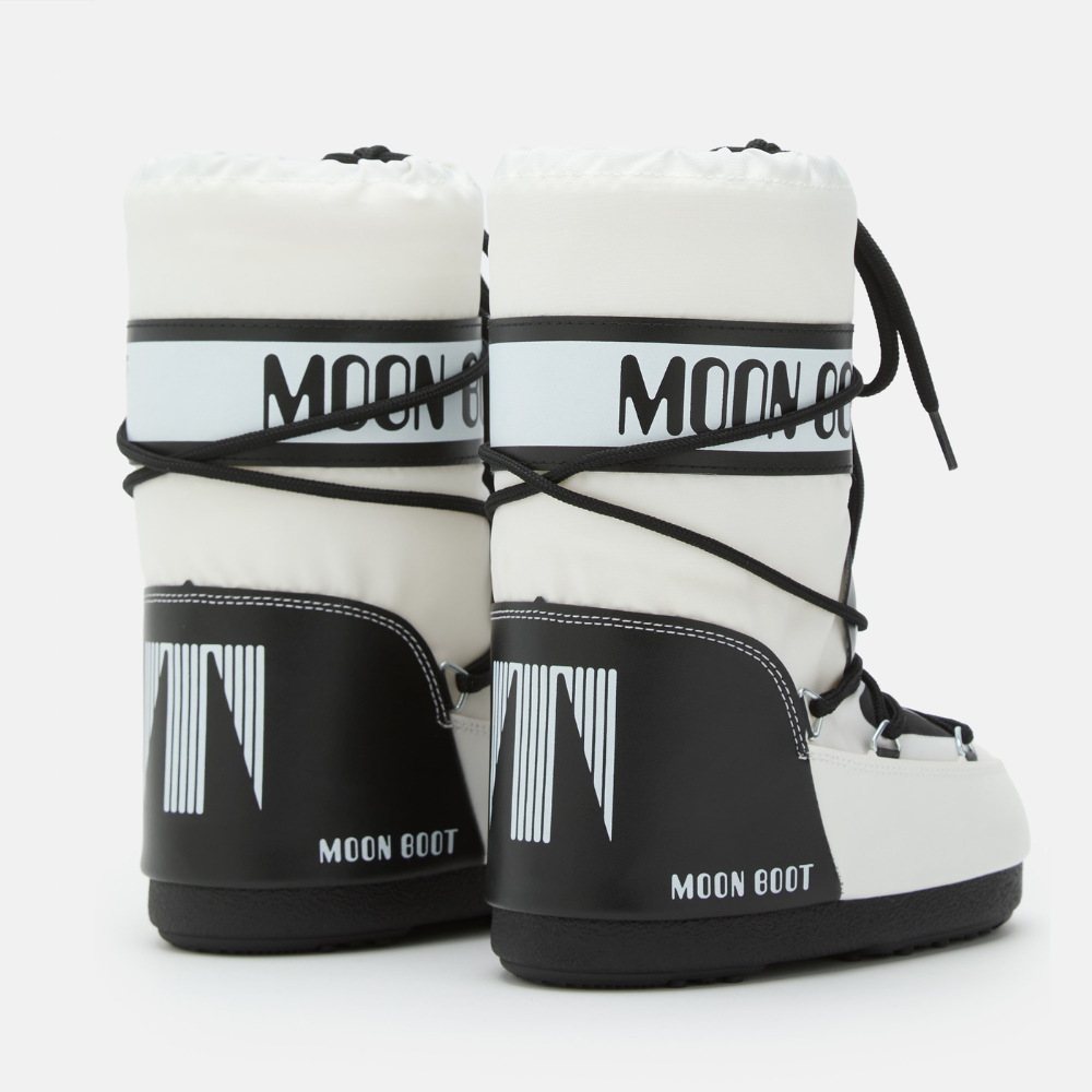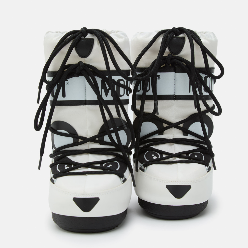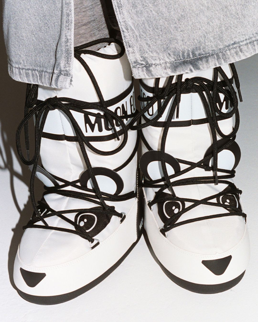 Svartir Moon Boot skór með sætu pöndu andliti. Skórnir eru innblásnir af tungl lendingunni 1969 og eru vel einangraðir með léttum millisóla og gripmiklum gúmmí sóla. Skórnir eru fóðraðir með svokölluðu froðufóðri sem hefur verið hannað til að laga sig að fætinum og veitir fullkomin þægindi. Fóðrið býður upp á þann eiginleika að hvert par spannar allt að þrjár stærðir.