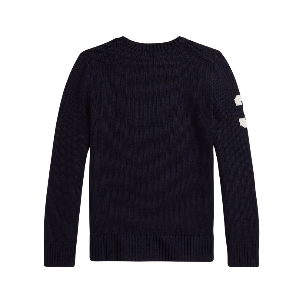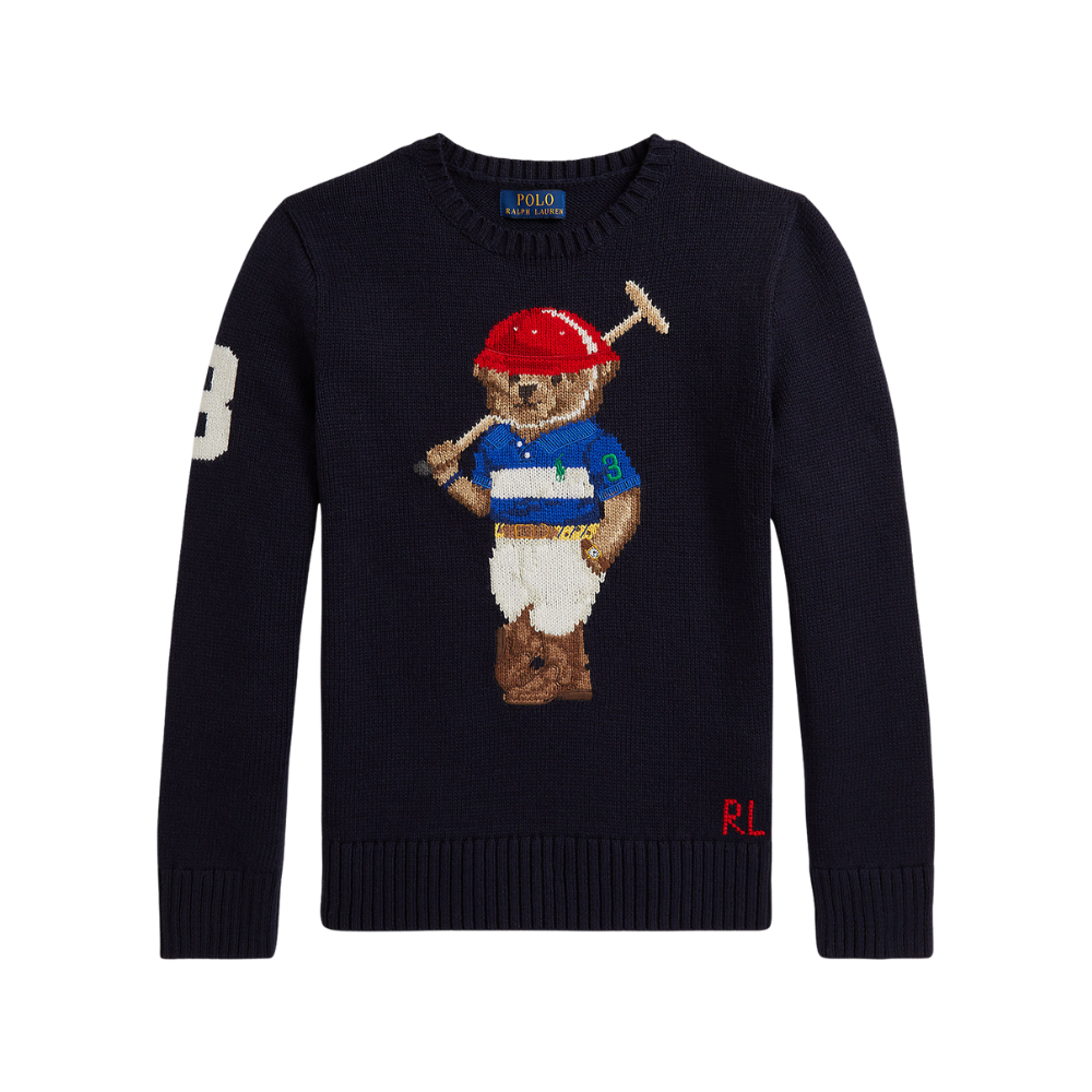 Dökk blá, falleg prjónapeysa með útsaumuðum bangsa að framan. S (8), M (10-12), L (14-16) og XL (18-20).
