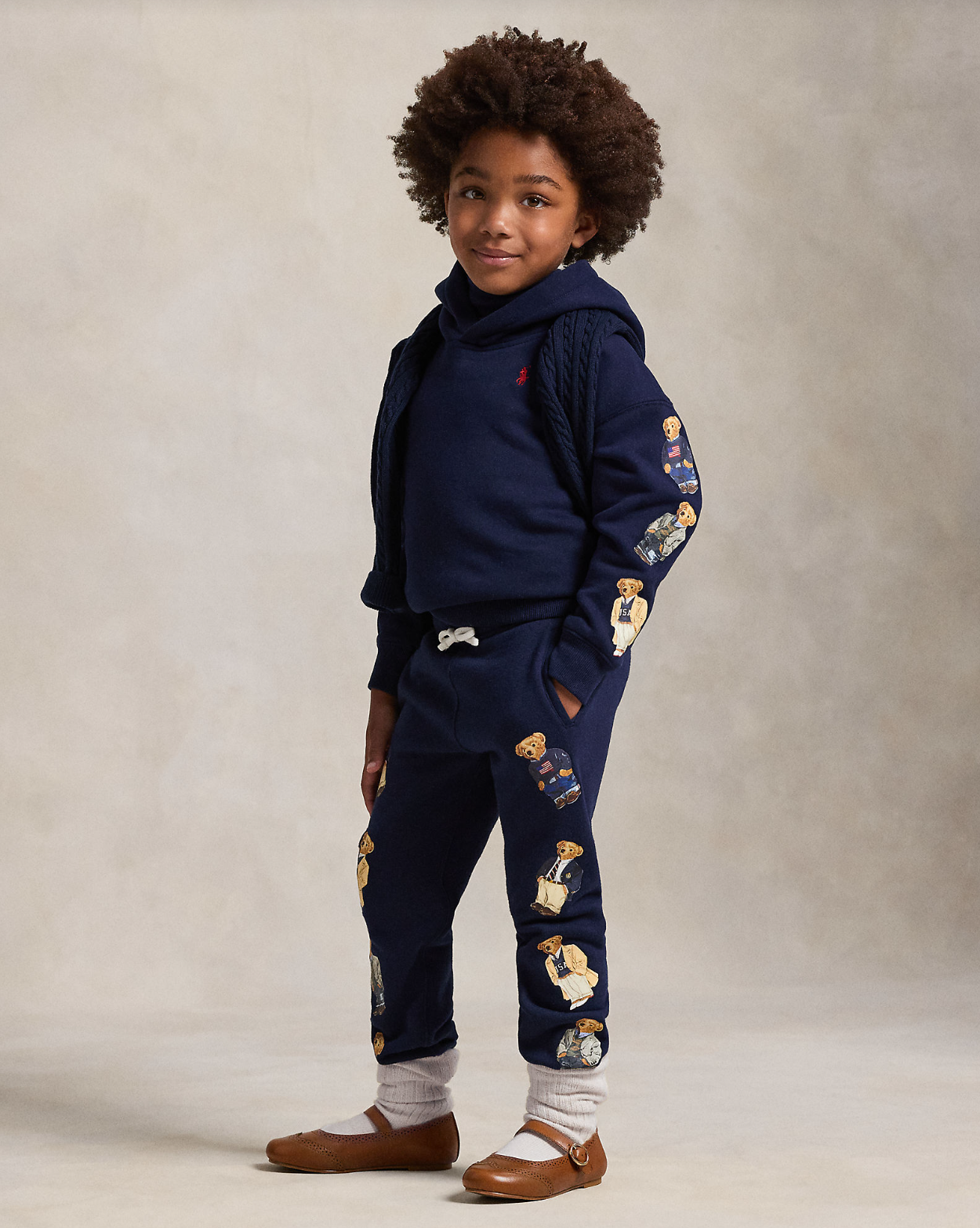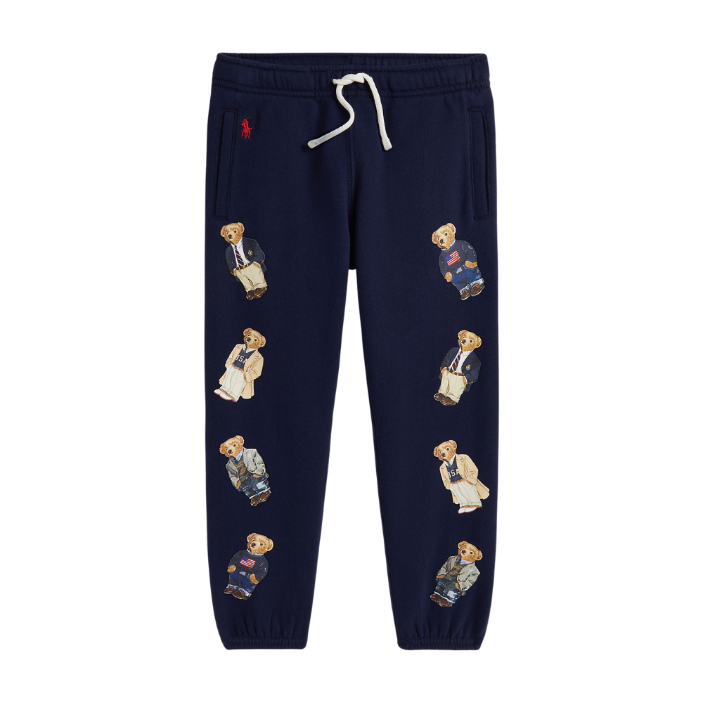 Dökk bláar joggingbuxur rá Polo Ralph Lauren með bangsamyndum niður eftir skálmum. Buxurnar eru bundnar í mittið.