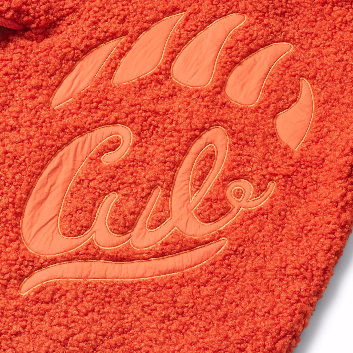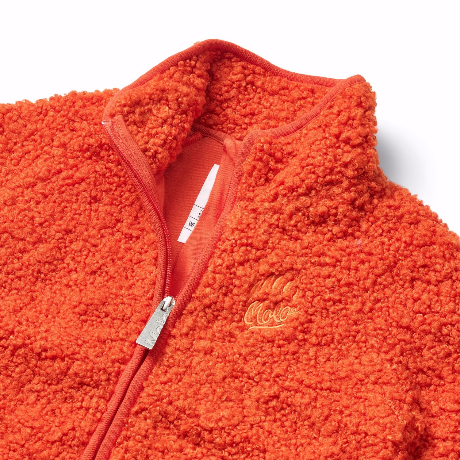 Dökk appelsínugul, fluffy flíspeysa frá Molo með stóru, útsaumuðu logo að aftan