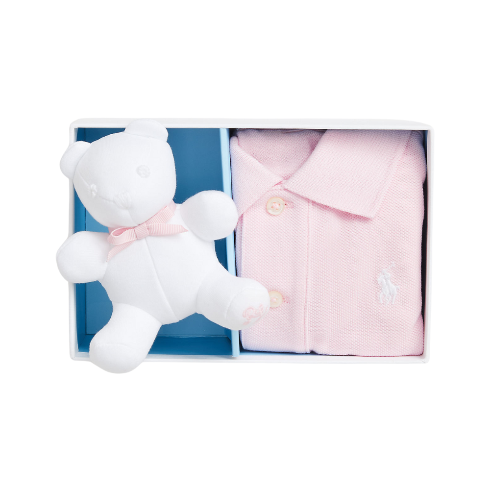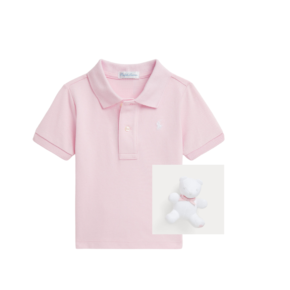 Fallegur gjafakassi frá Polo Ralph Lauren sem inniheldur ljós bleikan kragabol og lítinn bangsa.