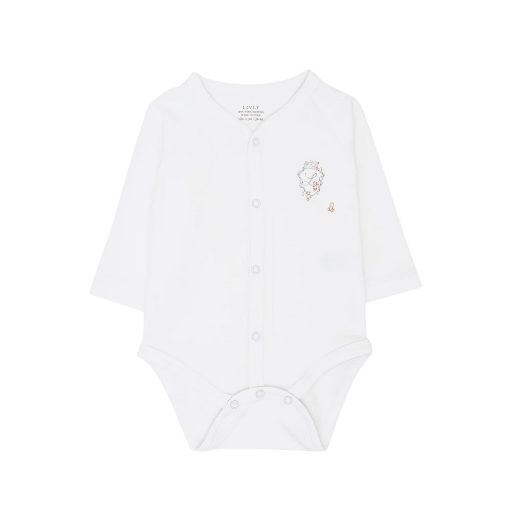 Hvít skáhneppt samfella frá sænska merkinu Livly. Samfellan er úr hágæða, lífrænni Pima bómull.