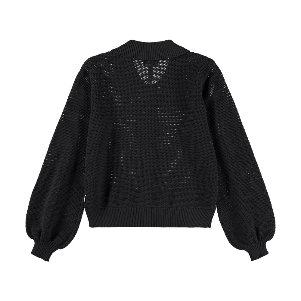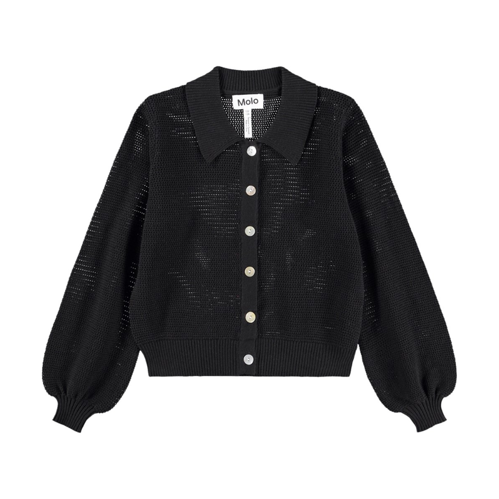 Svört, falleg jakkapeysa frá Molo með smáu gatamynstri. Peysan er hneppt.