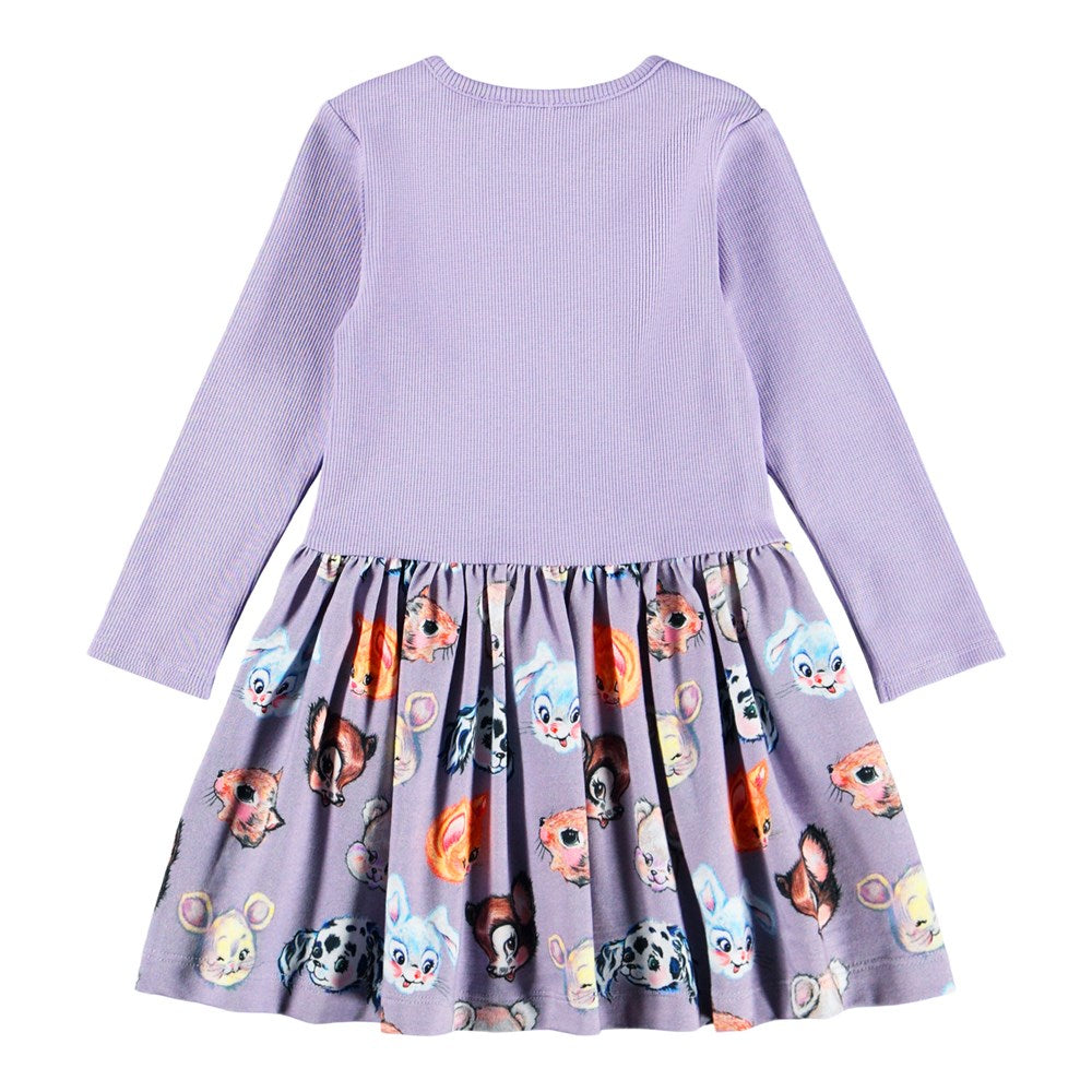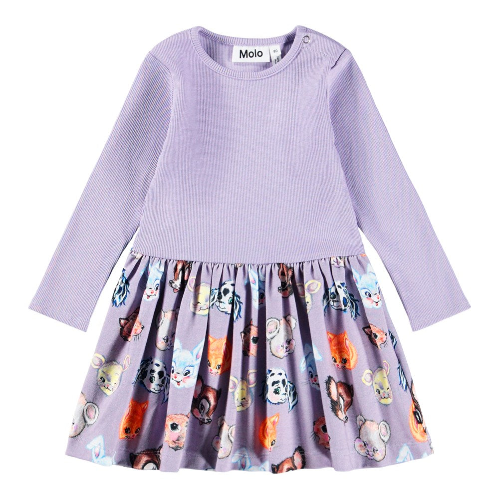 Molo kjóll með löngum ermum, mynstruðu pisi og einlitum efri hluta.