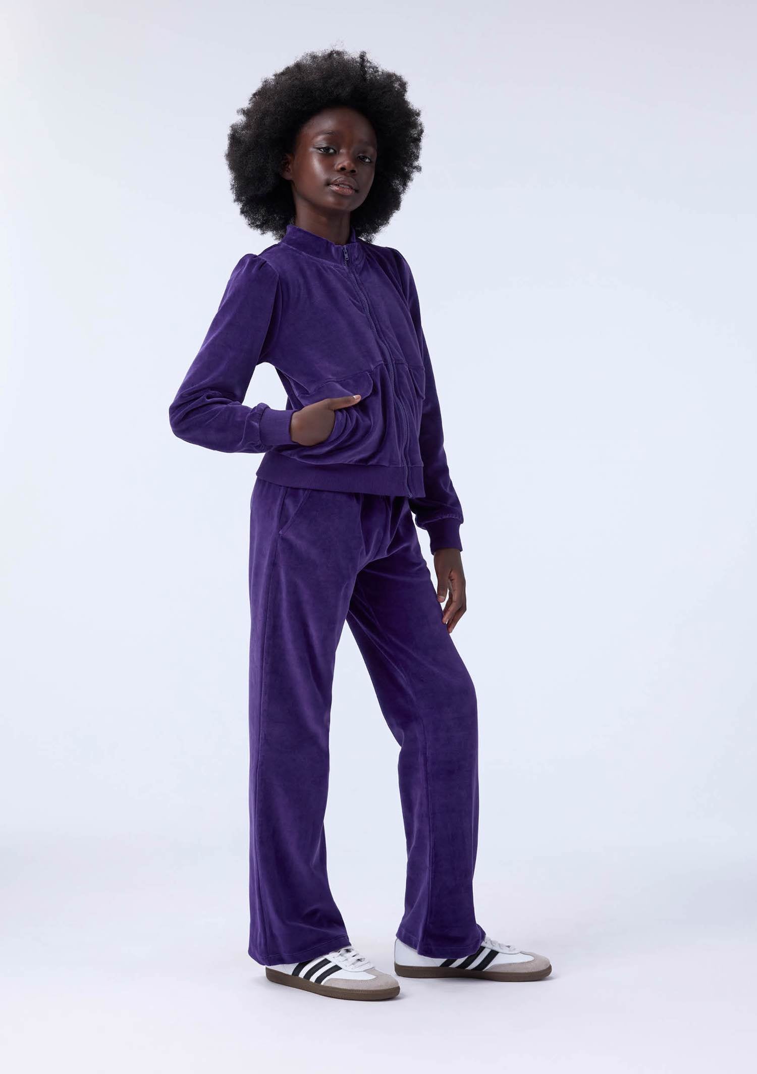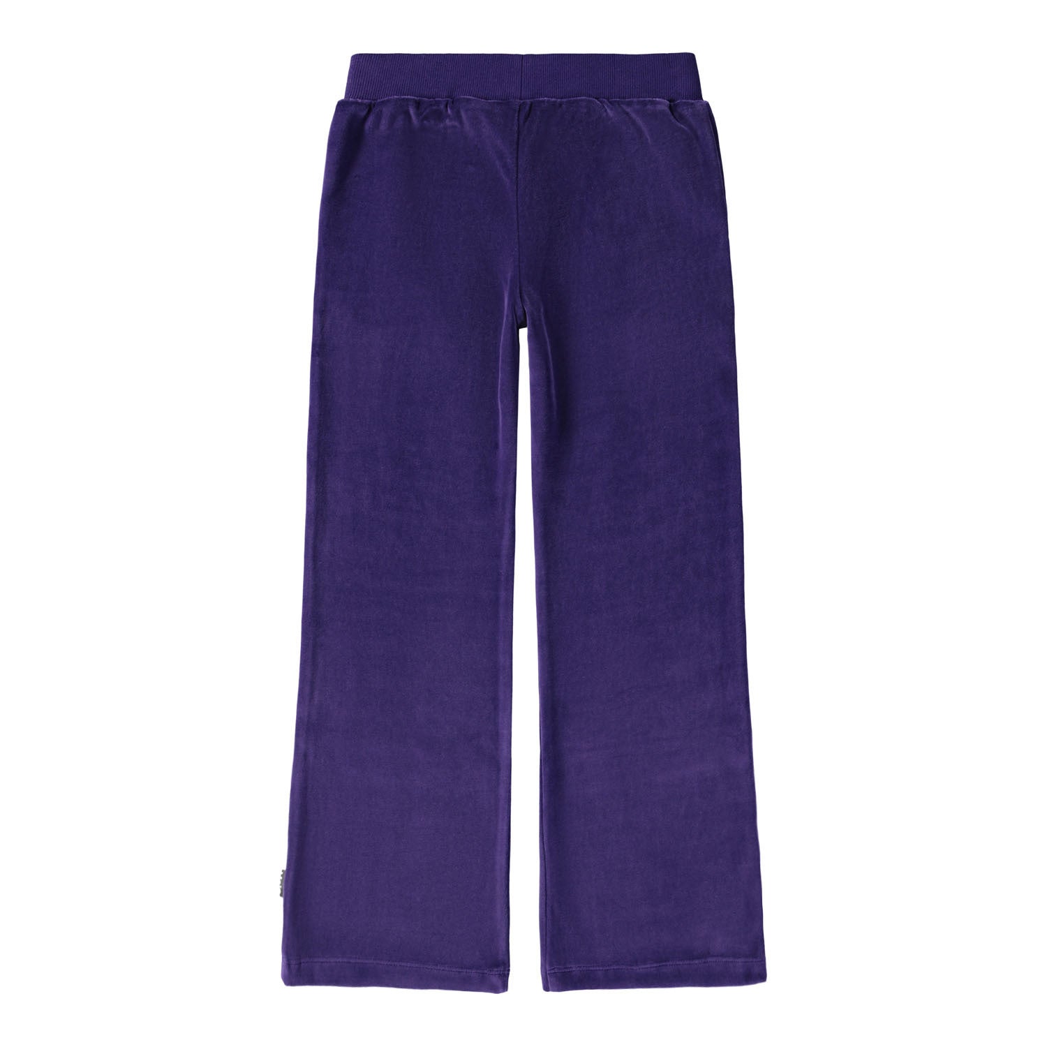 Fjólubláar, útvíðar velour buxur frá Molo með teygju í mittð.
