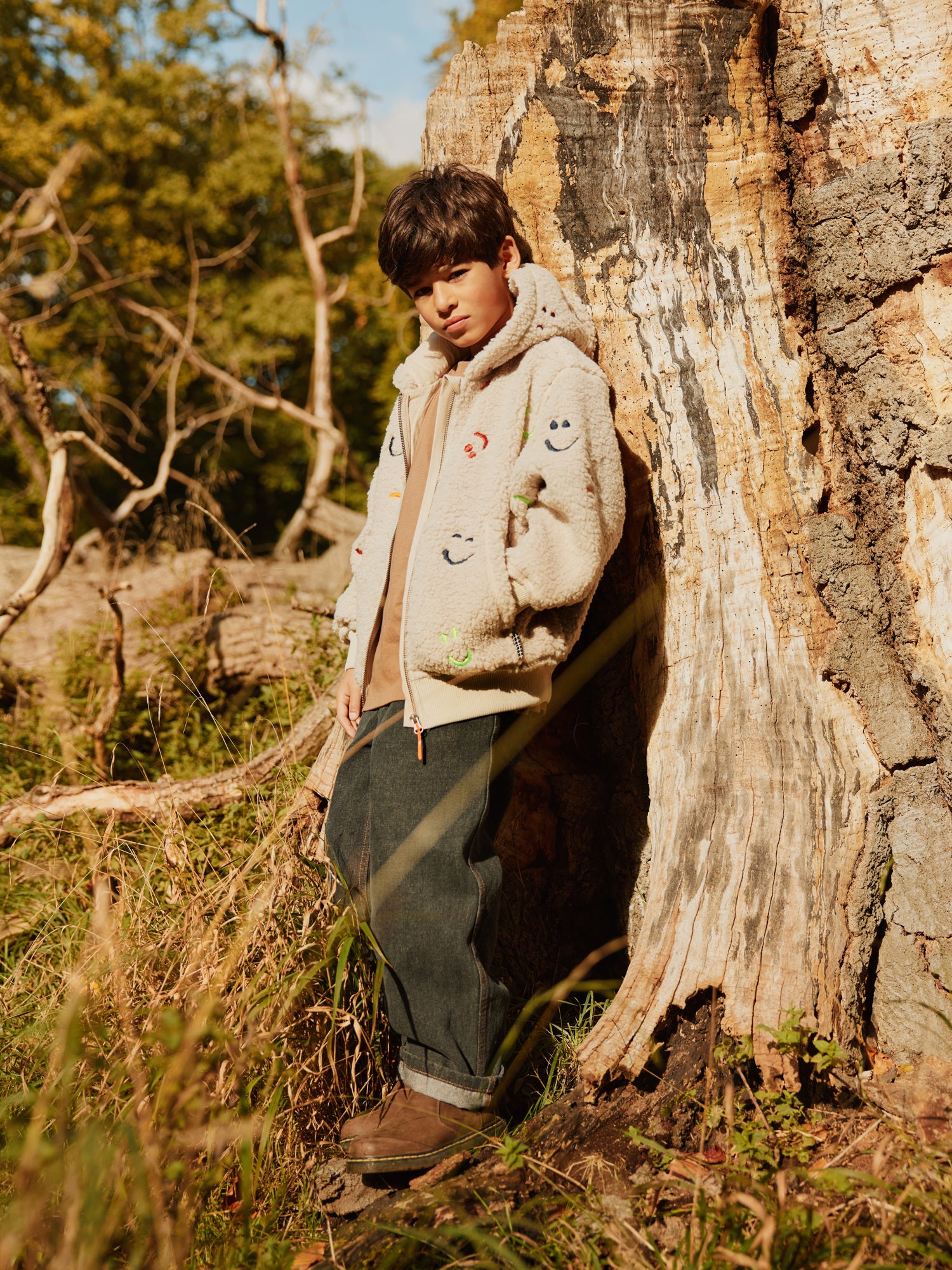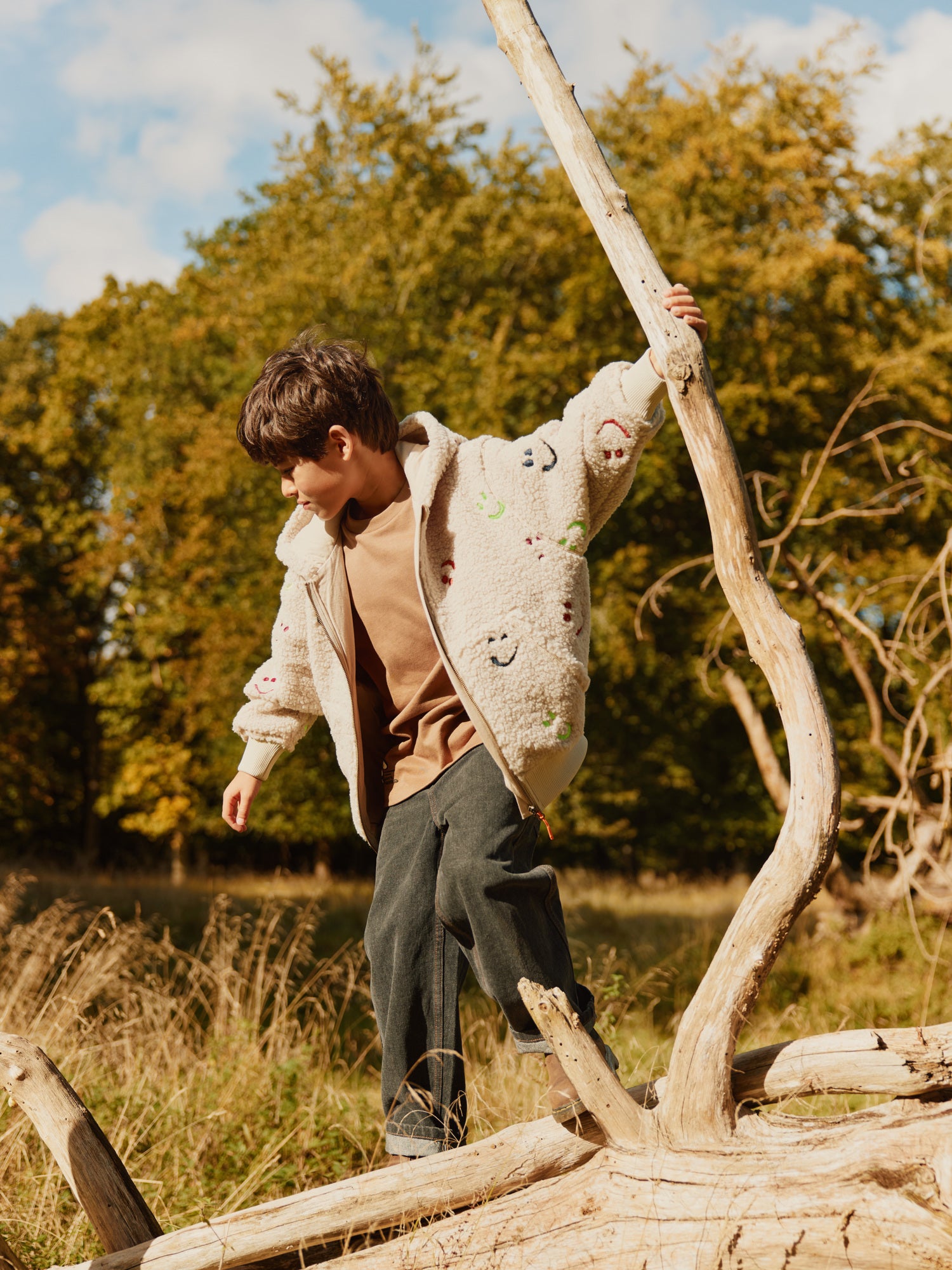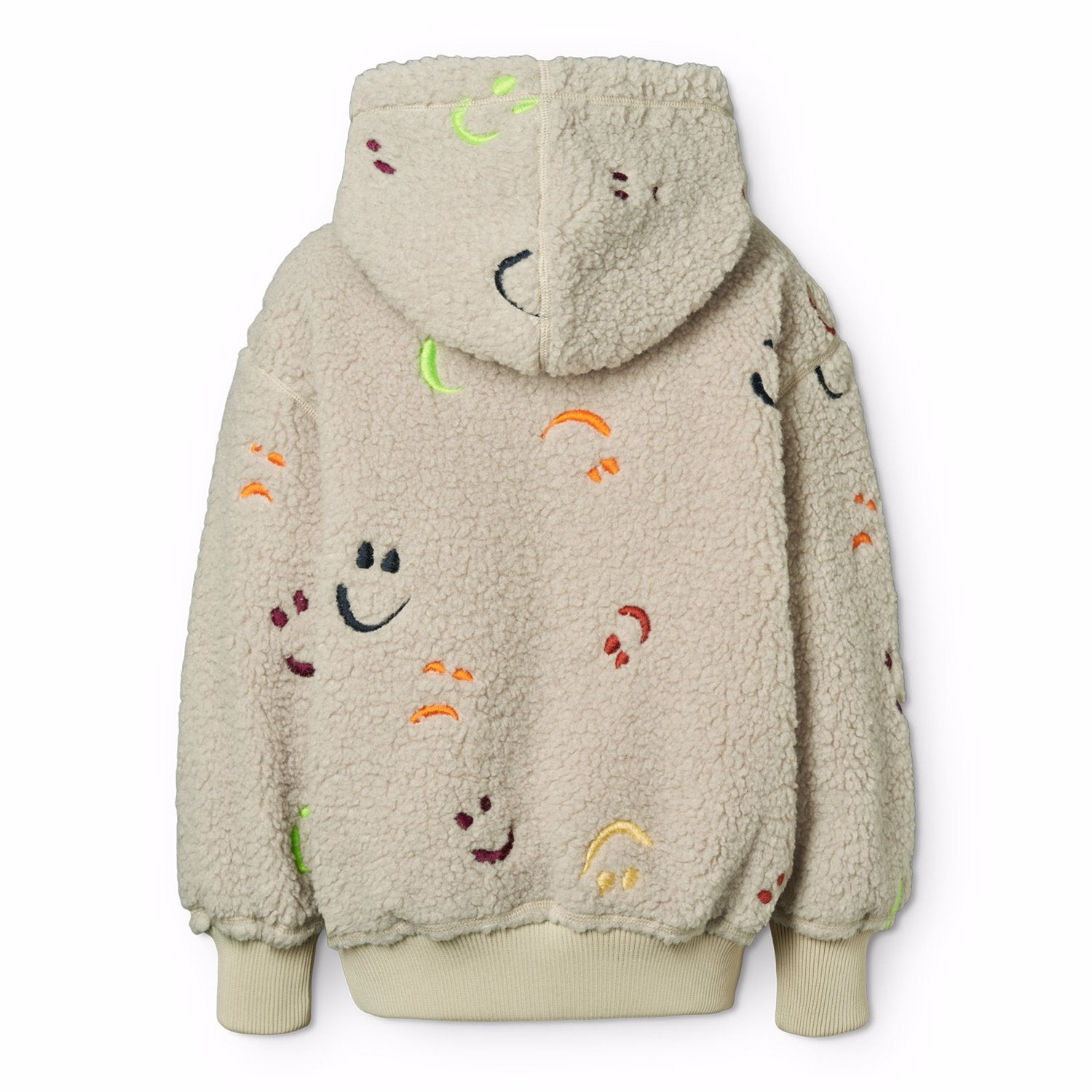 Ljós flíspeysa með litríku broskallamynstri. Peysan er rennd og með hettu. Stroff við ermar og mitti.