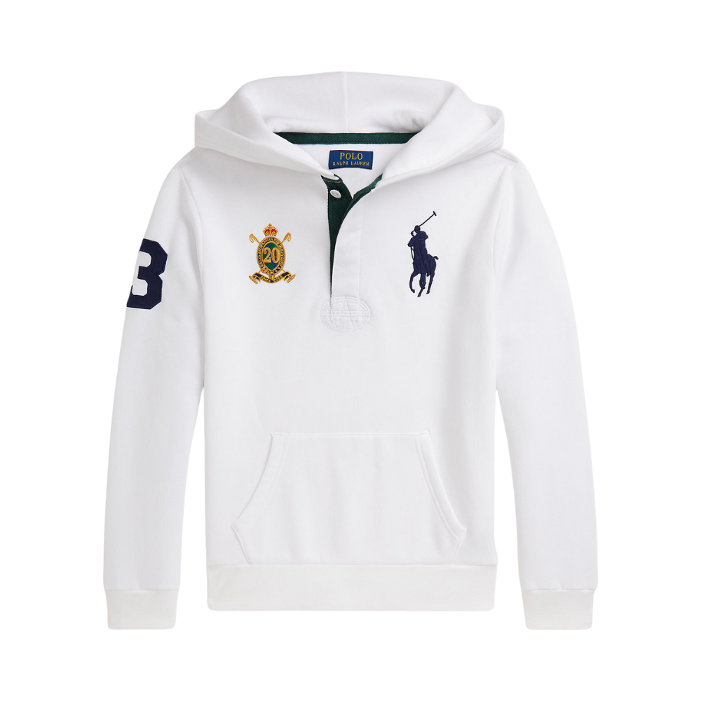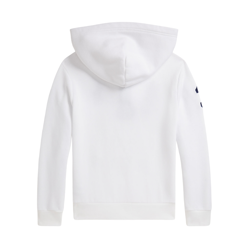 Hvít hettupeysa frá Polo Ralph Lauren. Peysan er hálf hneppt að framan og með stórum logoum að framan og á vinstri ermi.