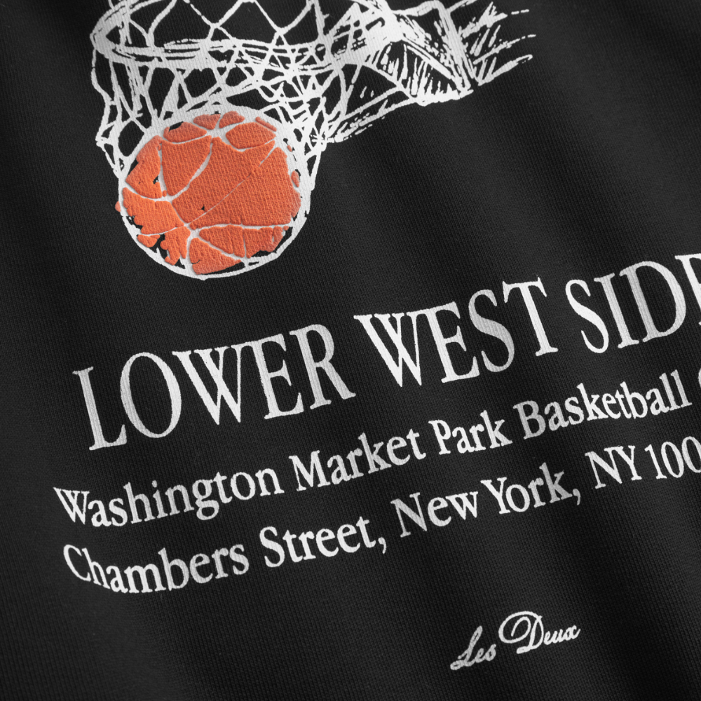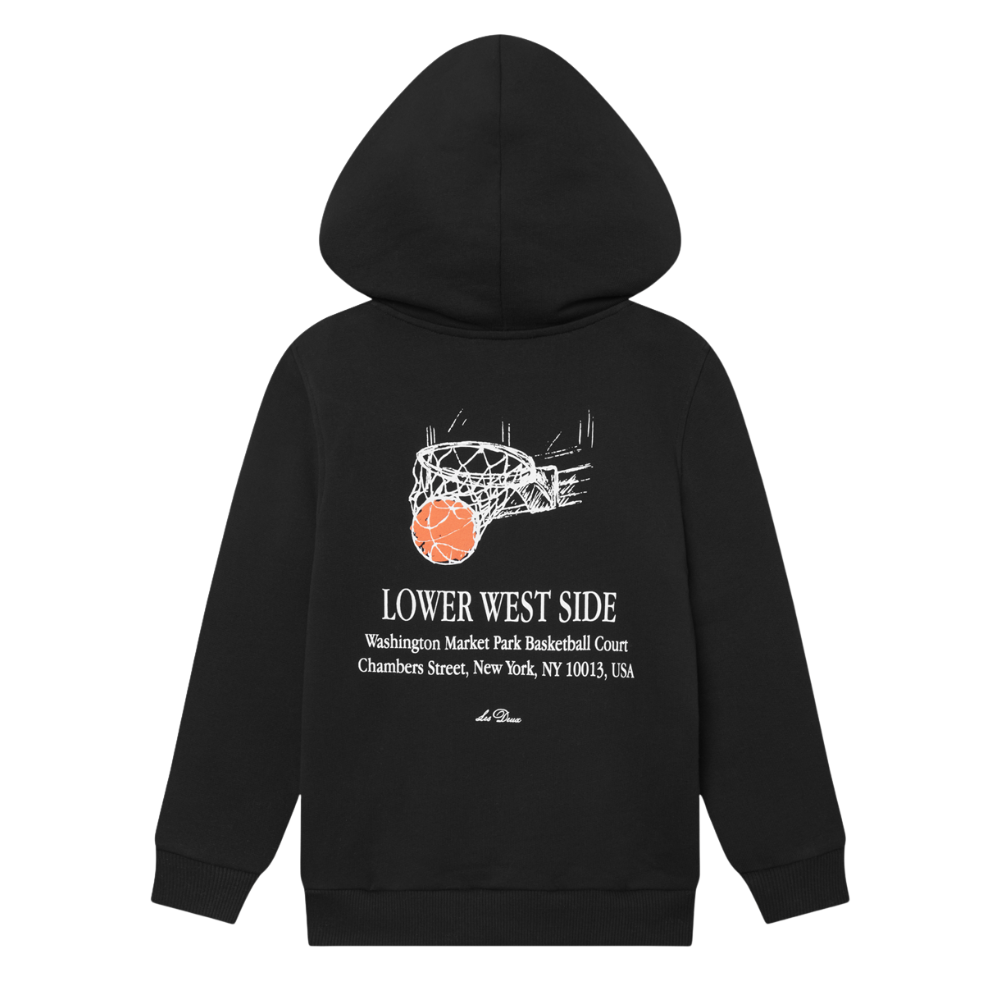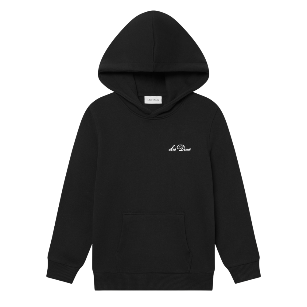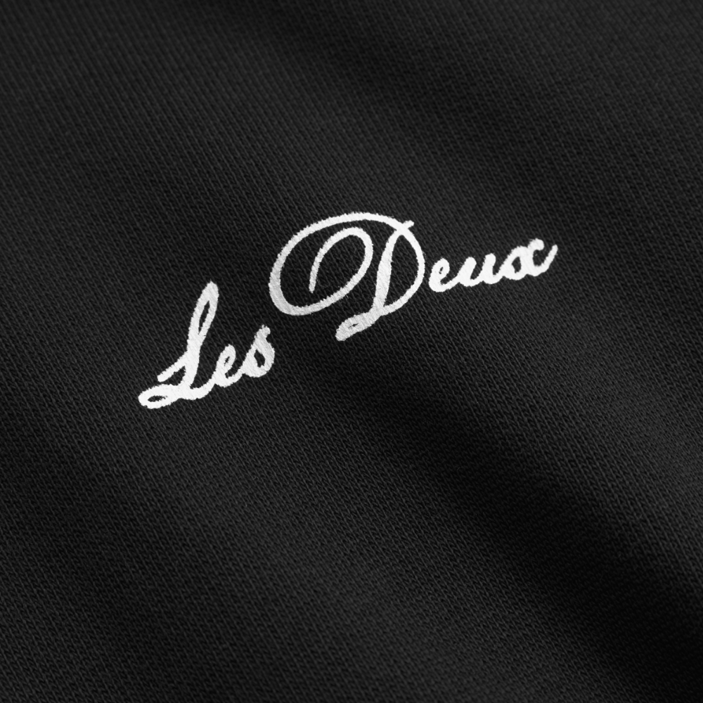 Svört joggingpeysa frá Les Deux með litlu logo að framan og stórri mynd að aftan.