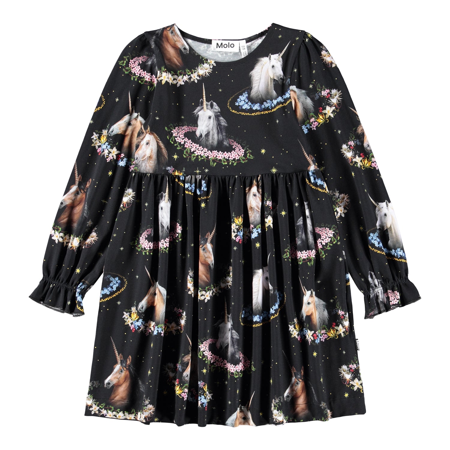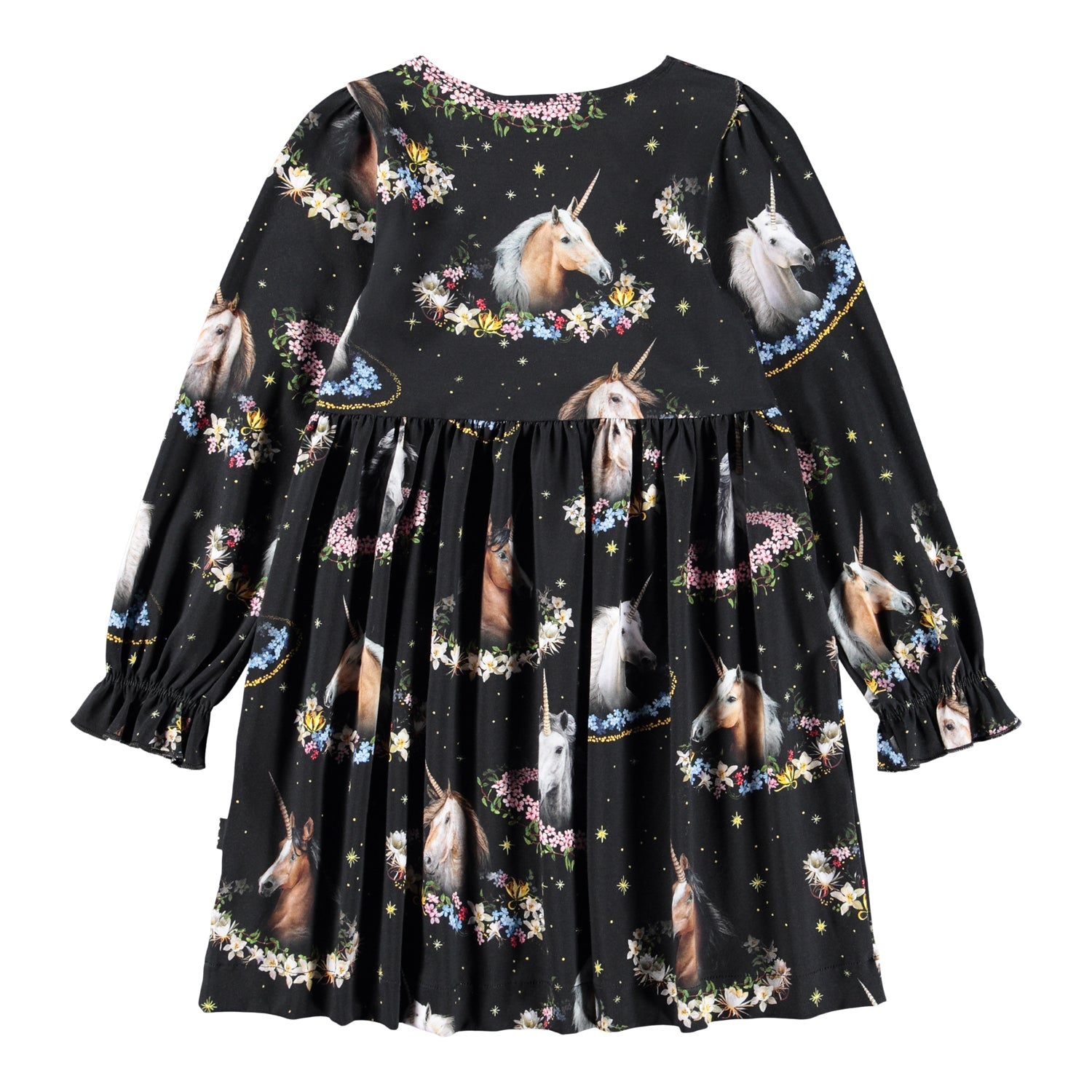 Mynstraður Molo kjóll með rykktum, pífuermum. Kjóllinn er tekinn saman í mittið.