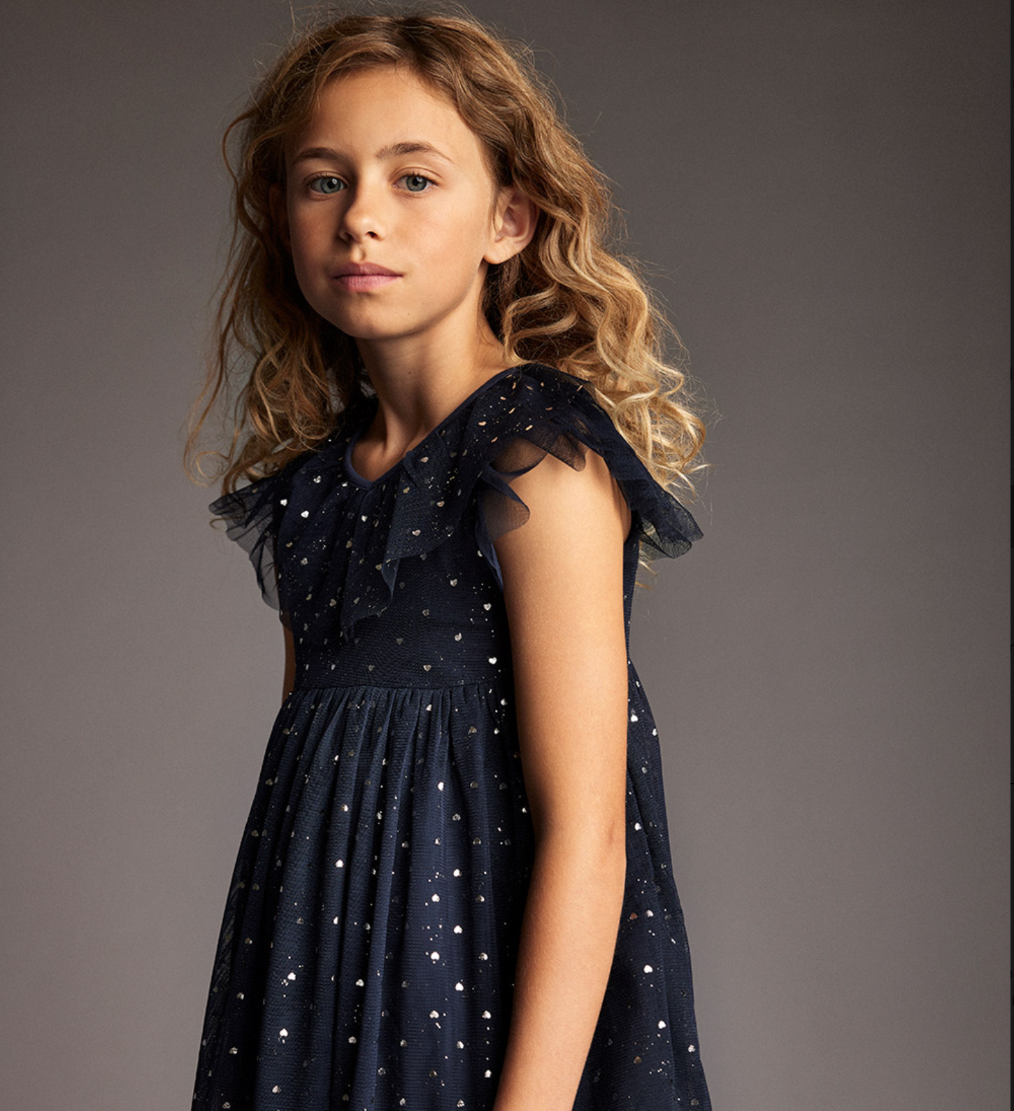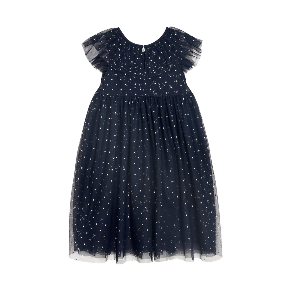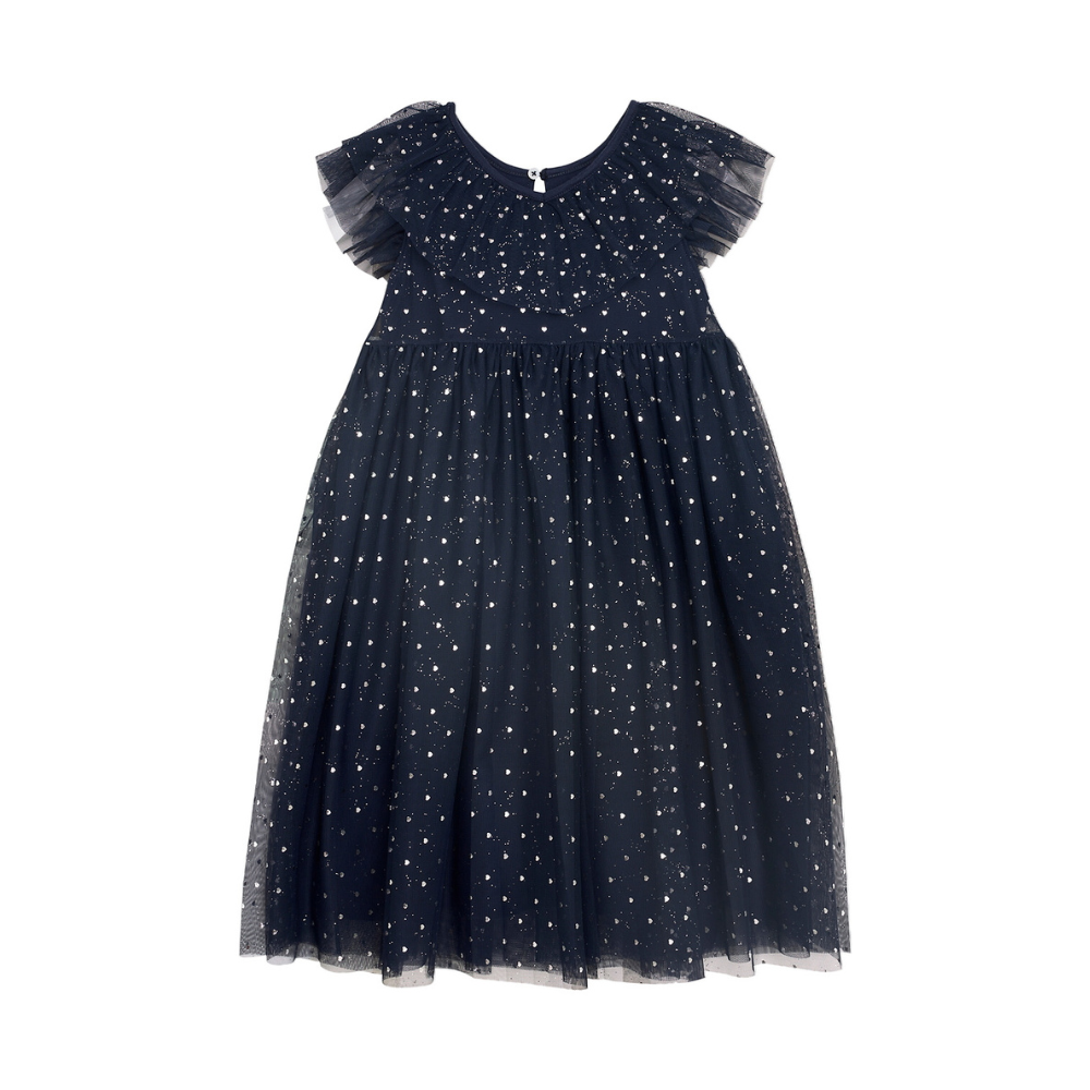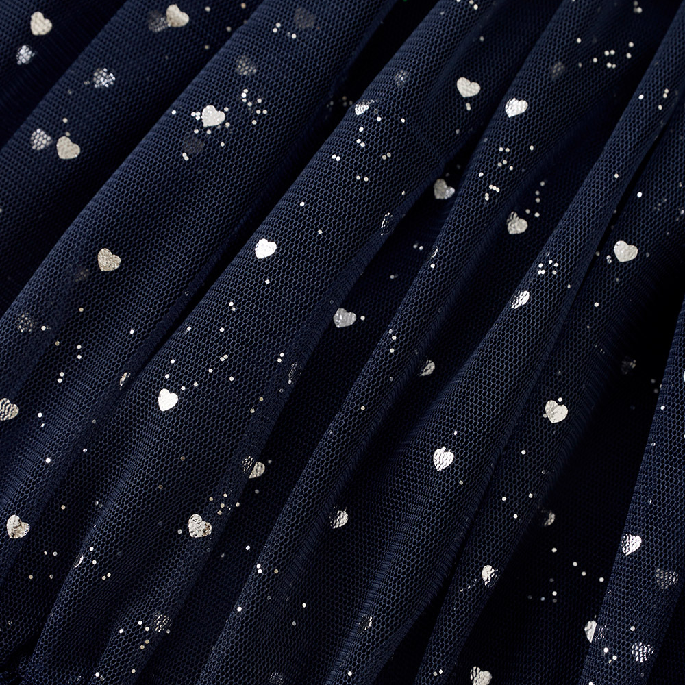 Fallegur, dökk blár, ermalaus kjóll frá Creamie með silfruðu pallíettu skrauti.