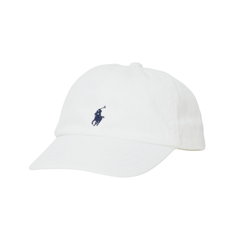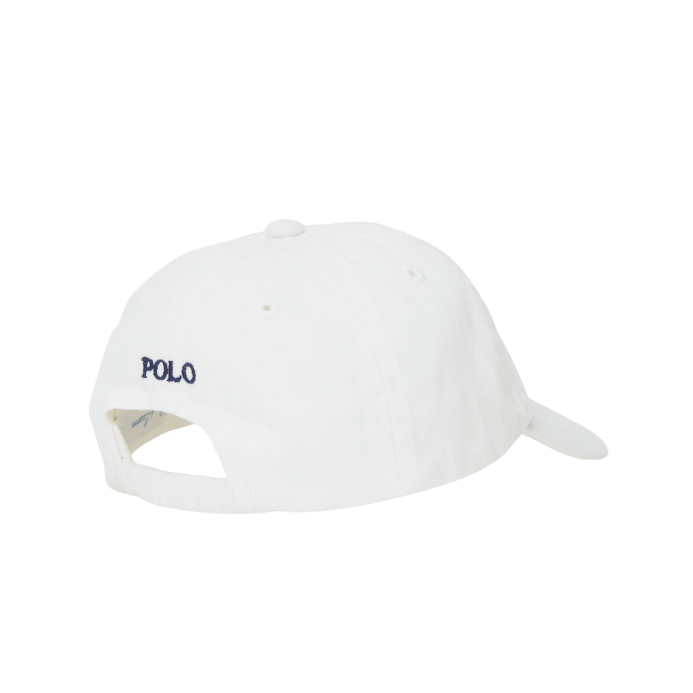 Hvít ungbarna derhúfa með bláu logoi að framan og aftan frá Polo Ralph Lauren.
