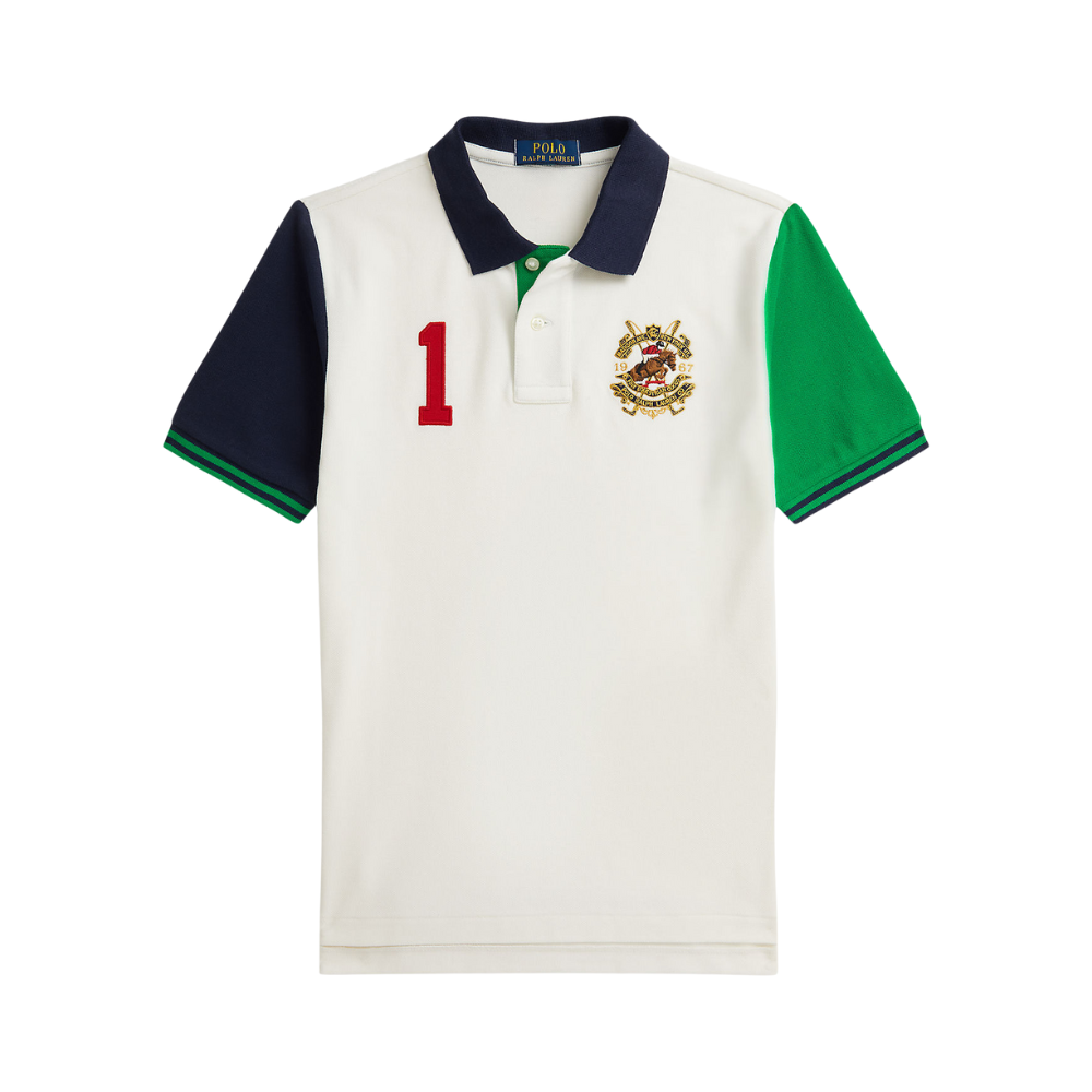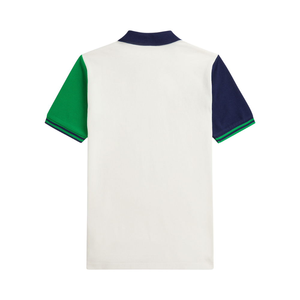 Hvítur kragabolur frá Polo Ralph Lauren með mislitum, stuttum ermum, kraga og stótu logo að framan.