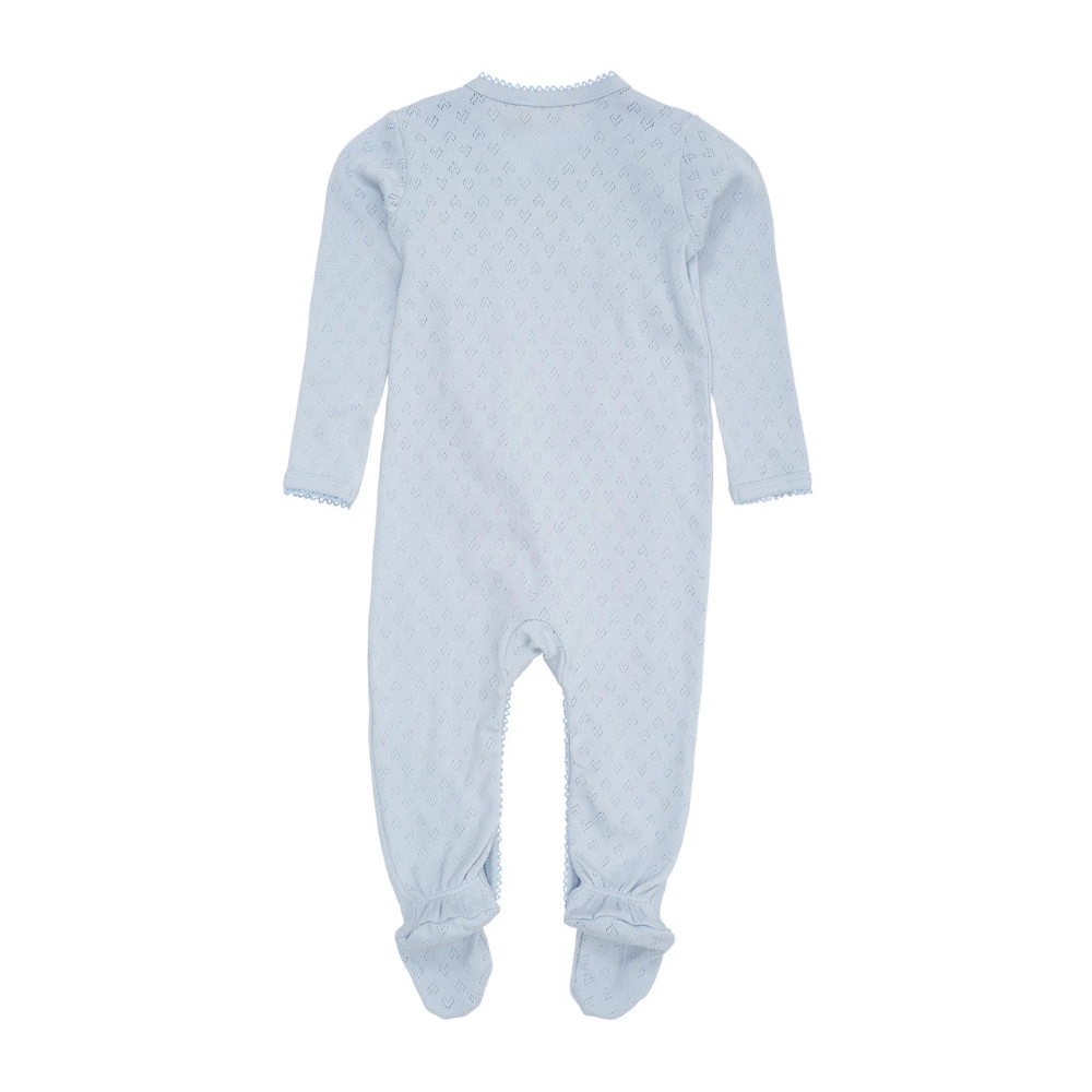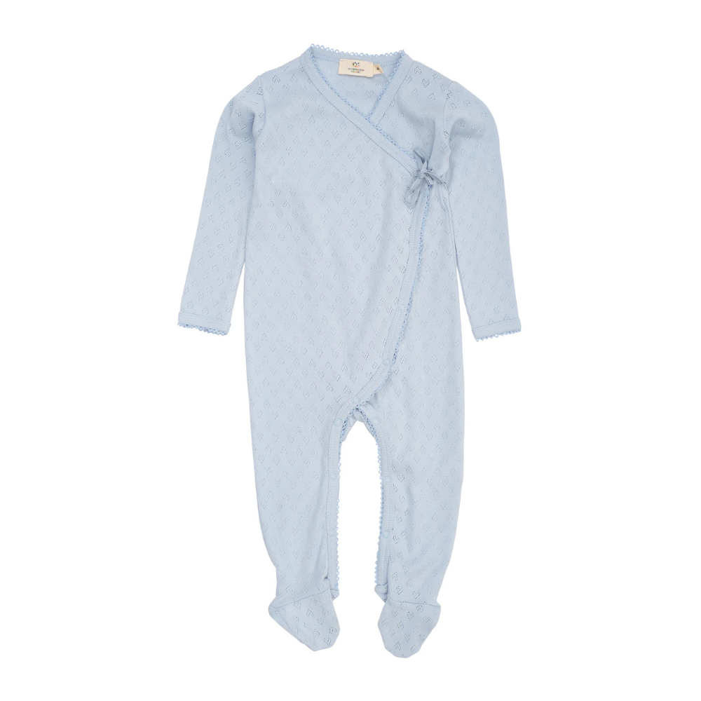 Ljós blár heilgalli frá Copenhagen Colors með smáu gatamynstri og áföstum sokkum . Gallinn er bæði smelltur og bundinn að framan.