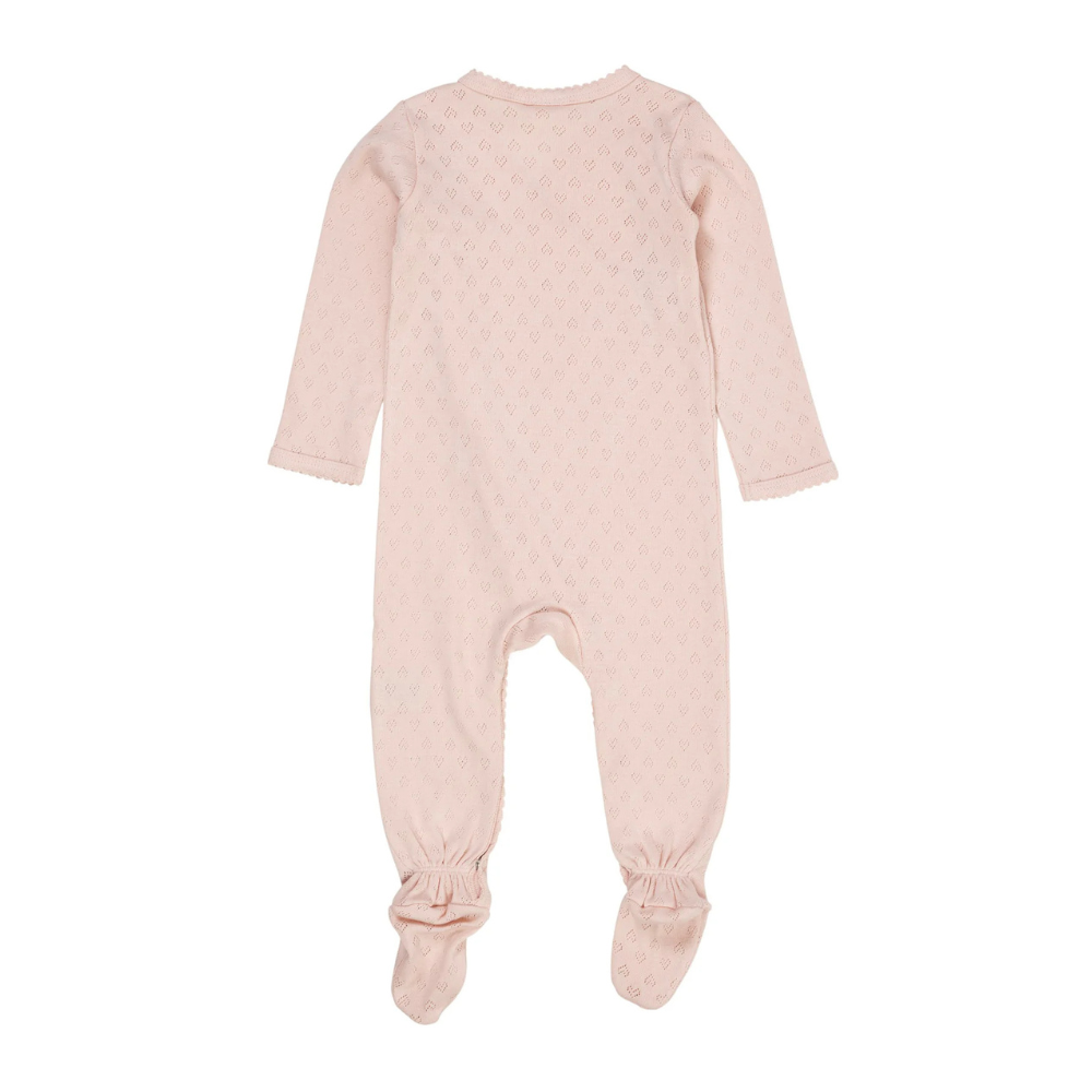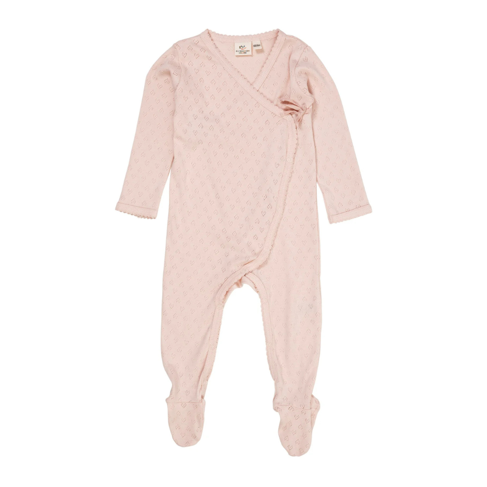 Ljós bleikur heilgalli frá Copenhagen Colors með smáu gatamynstri og áföstum sokkum . Gallinn er bæði smelltur og bundinn að framan.