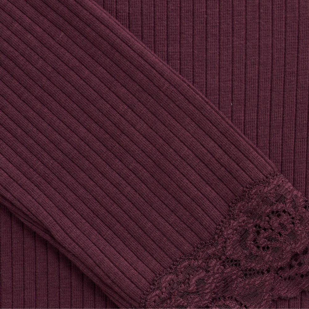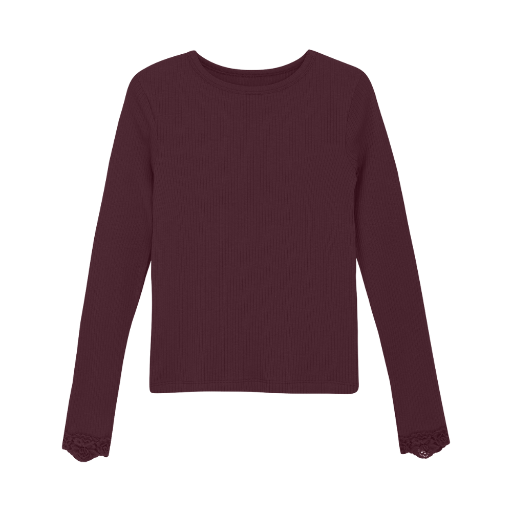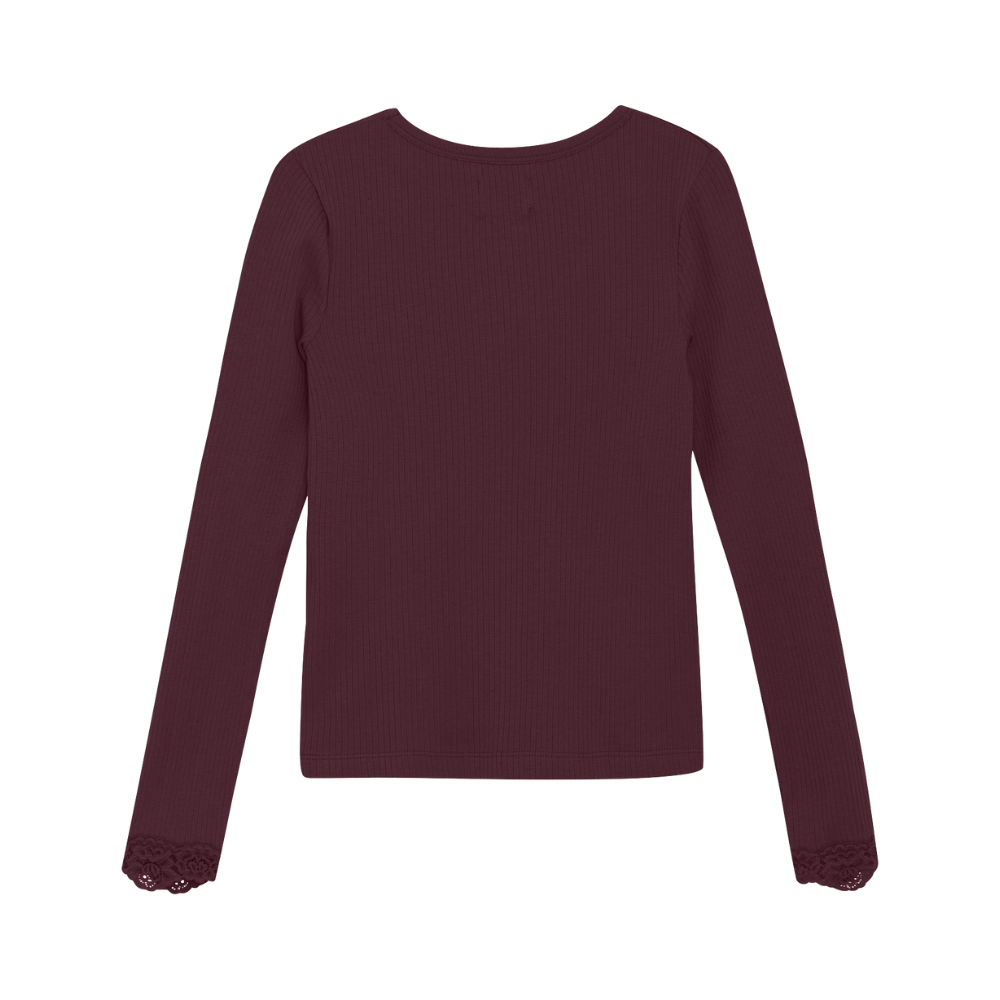 Vínrauður, langermabolur frá Creamie með pífu við ermar.