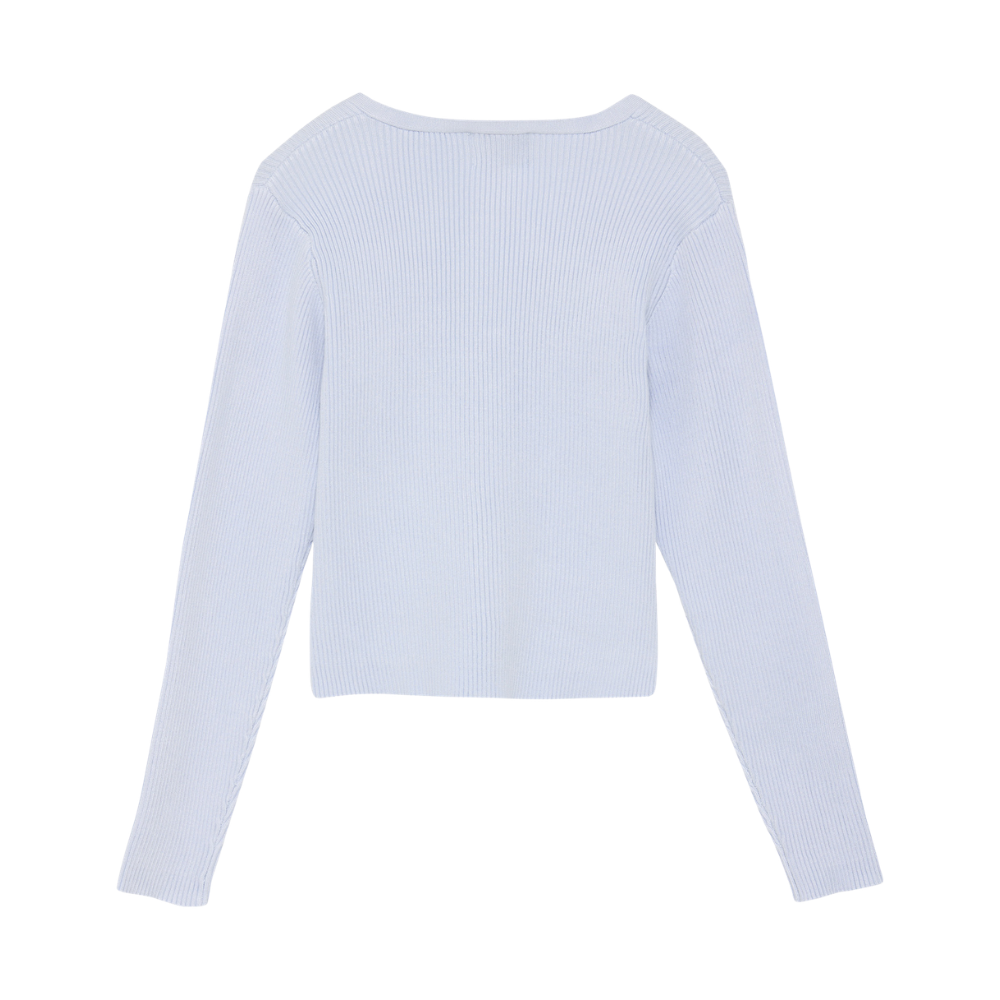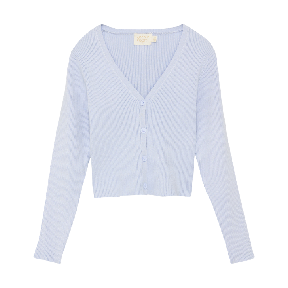 Ljós blá, hneppt peysa með V-hálsmáli.