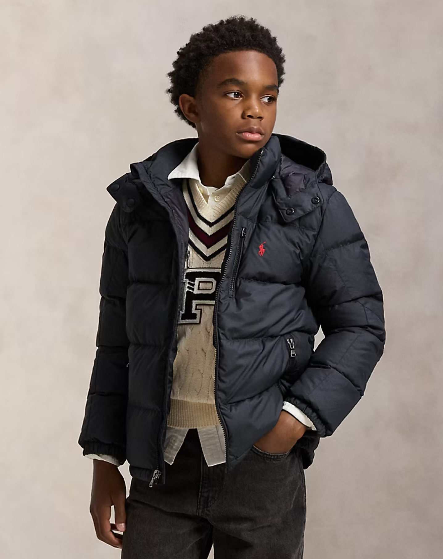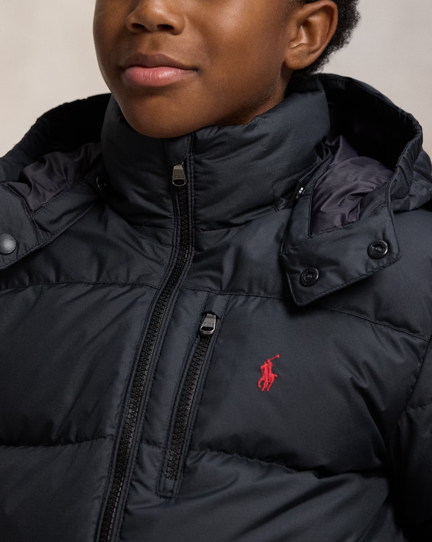 Svört dúnúlpa frá Polo Ralph Lauren með mattri áferð og útsaumuðu logo vinstra megin að framan. Úlpan er vantsfráhrindandi og með hettu sem hægt er að fjarlægja. Úlpan er rennd að framan og með renndum brjóstvasa ásamt vösum á hliðum og innri brjóstvasa hægra megin.