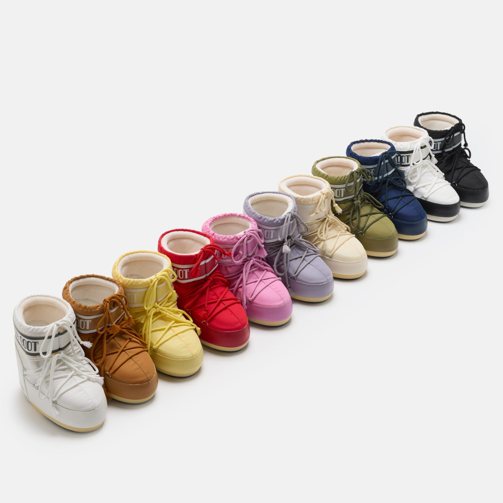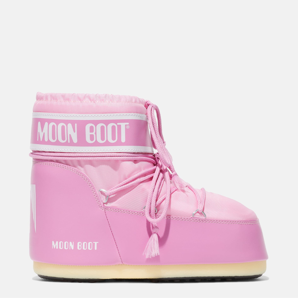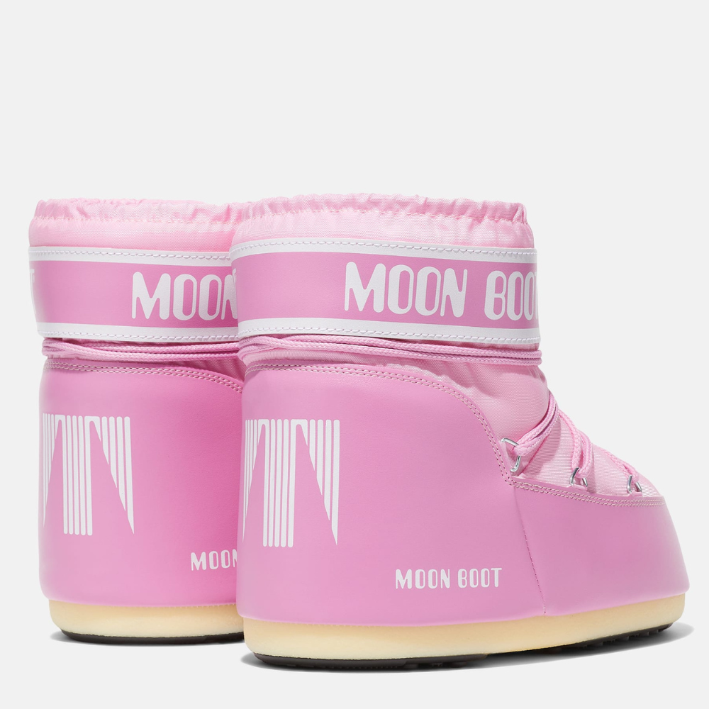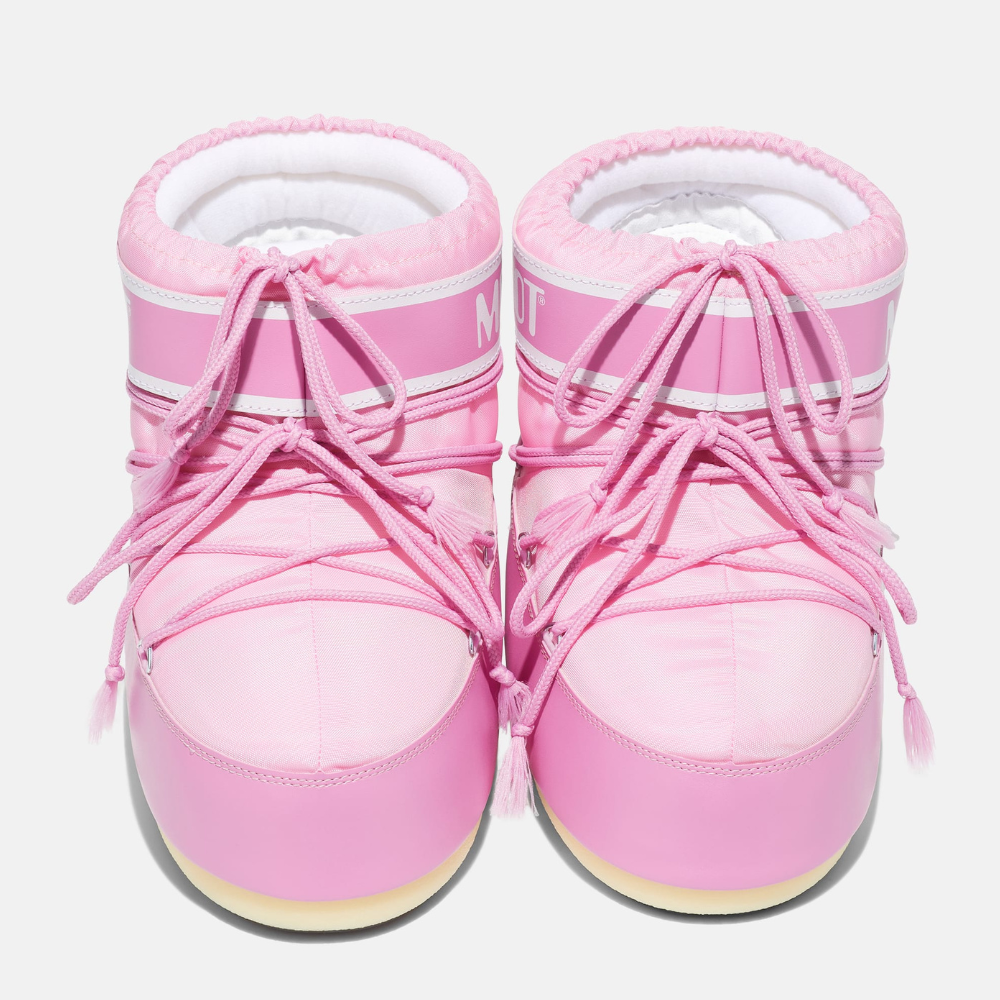Bleik, lág Moon Boot. Skórnir eru innblásnir af tungl lendingunni 1969 og eru vel einangraðir með léttum millisóla og gripmiklum gúmmí sóla. Skórnir eru fóðraðir með svokölluðu froðufóðri sem hefur verið hannað til að laga sig að fætinum og veitir fullkomin þægindi. Fóðrið býður upp á þann eiginleika að hvert par spannar allt að þrjár stærðir.