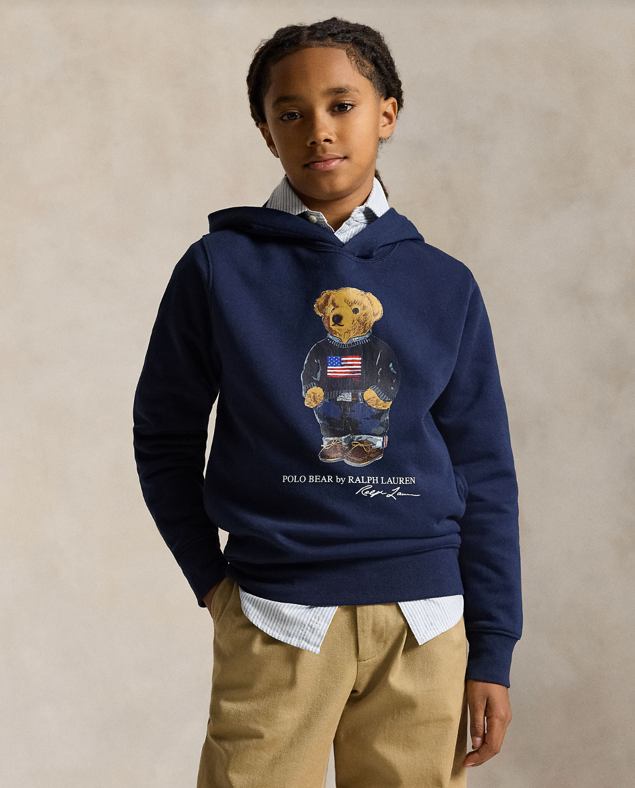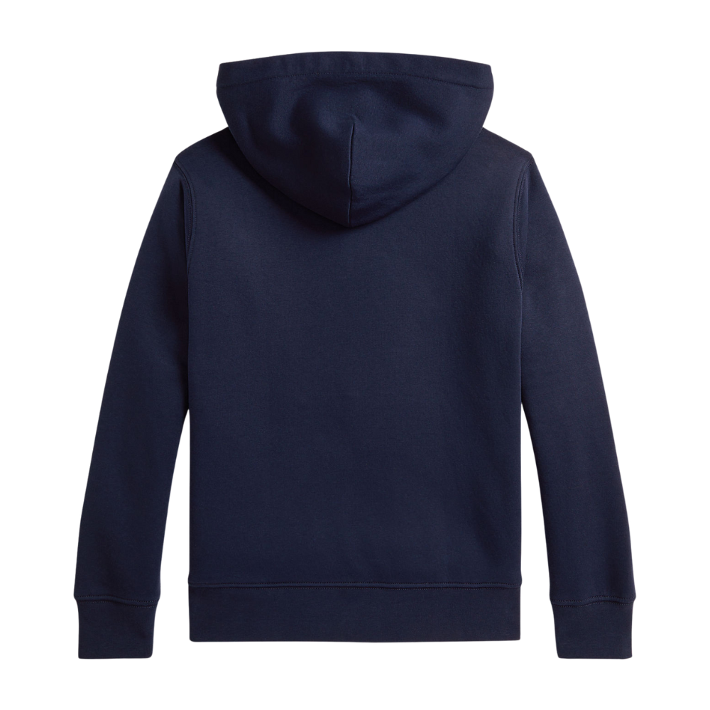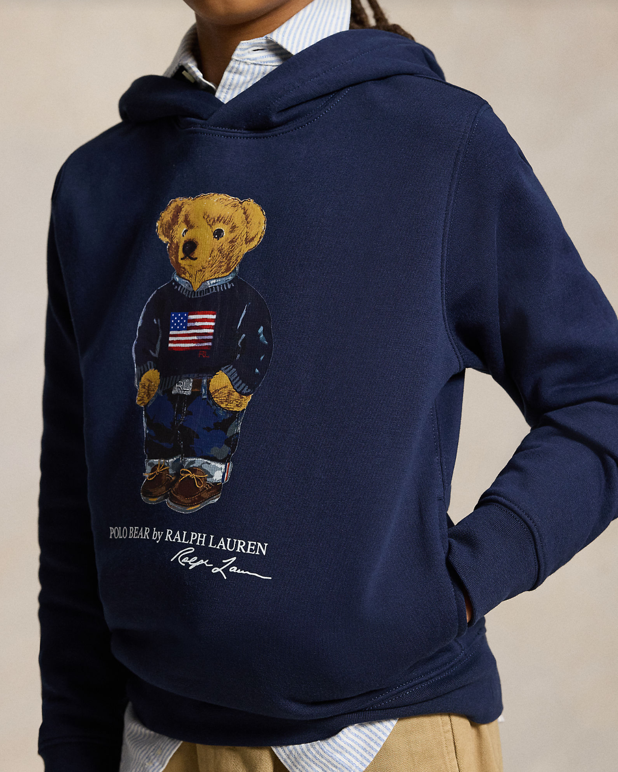 Dökk blá hettupeysa með bangsa mynd að framan.
