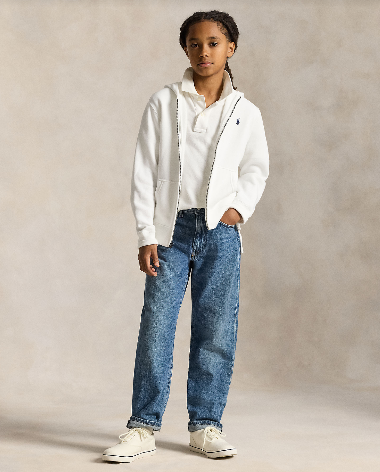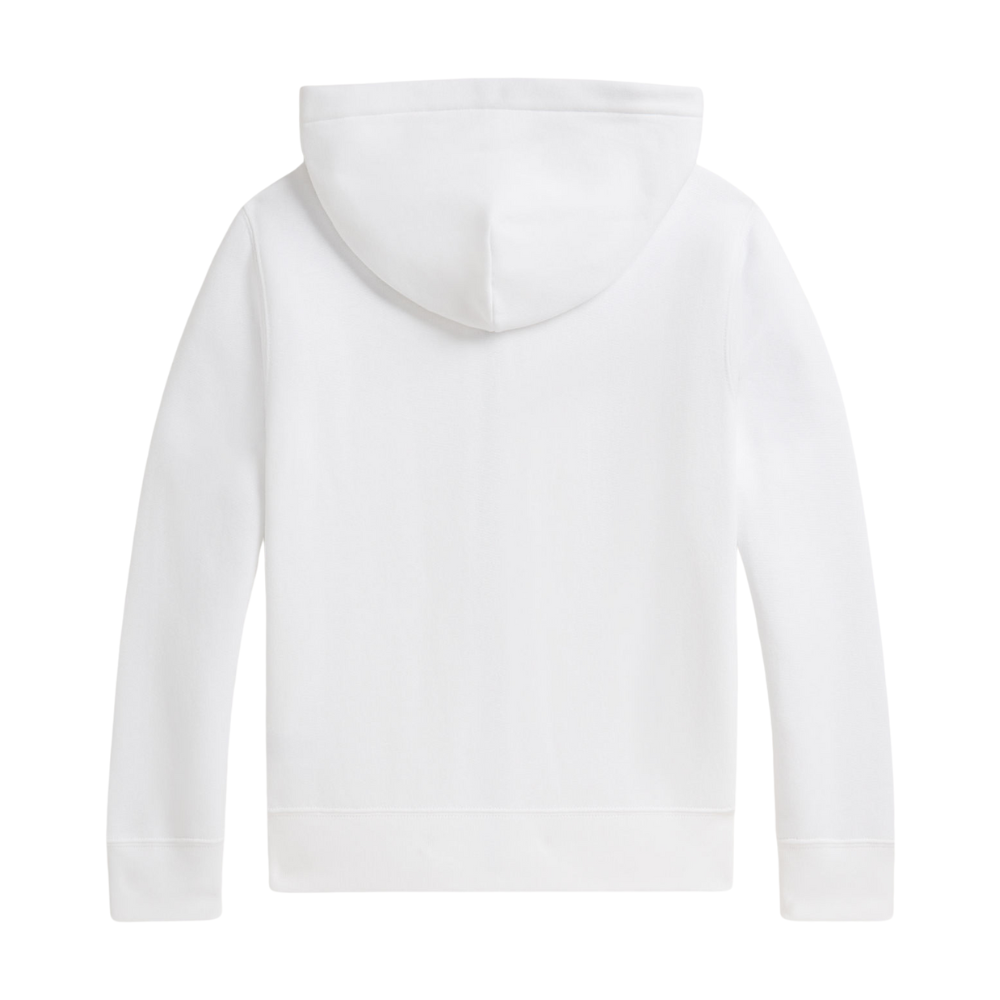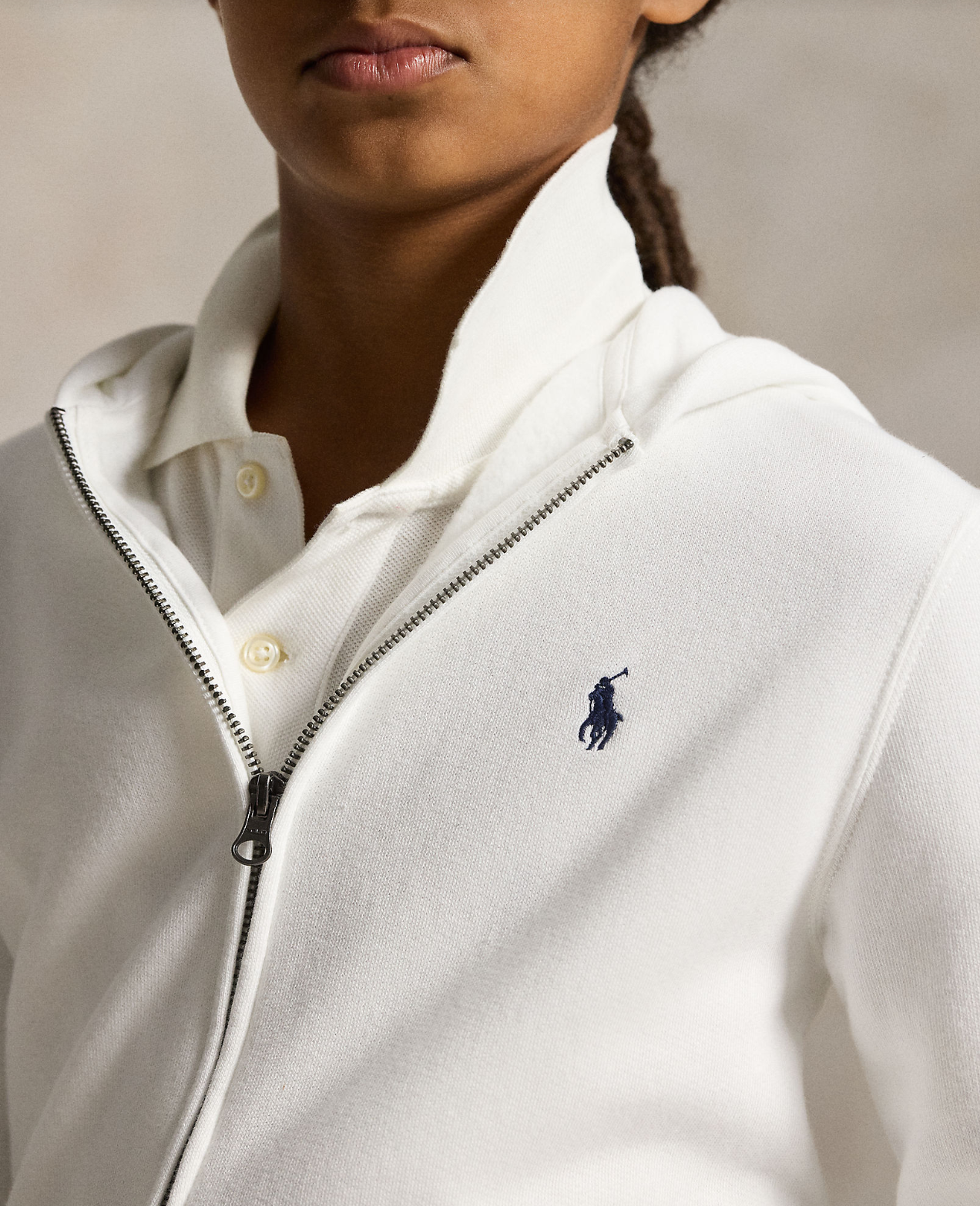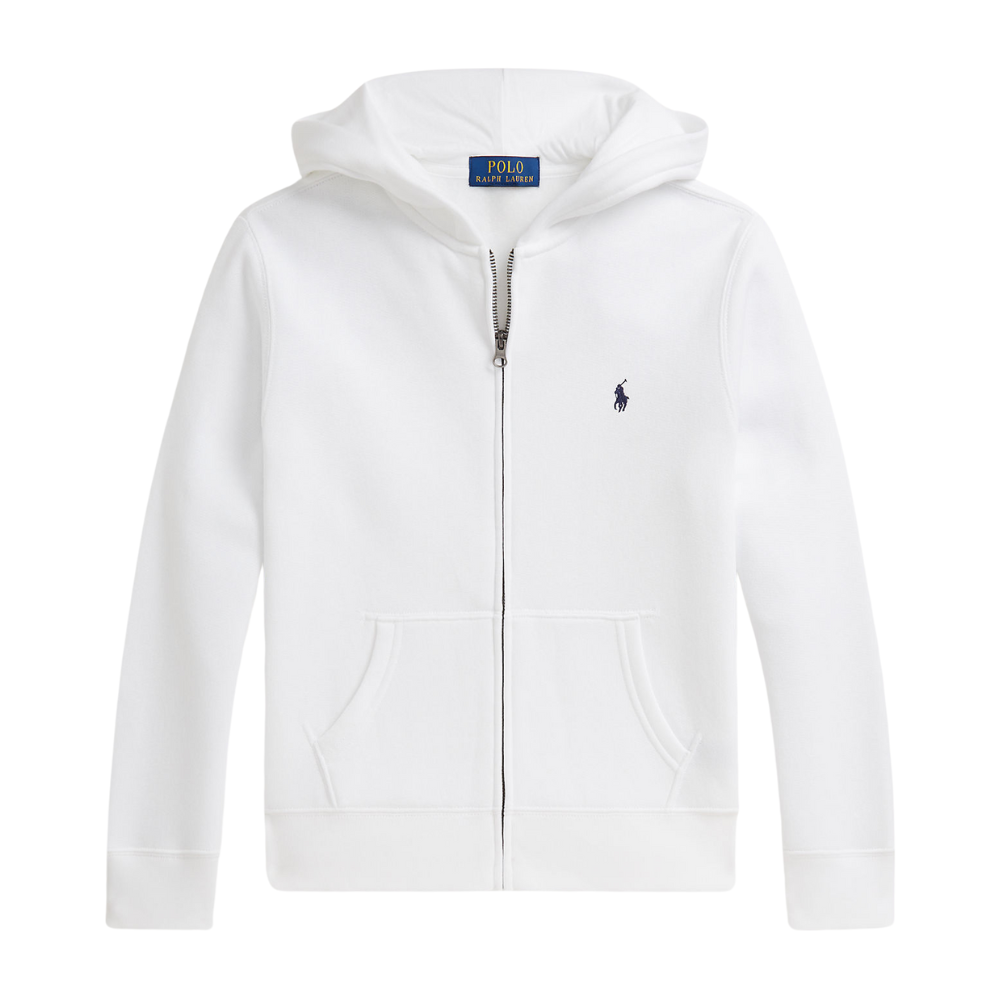 Hvít, rennd hettupeysa frá Polo Ralph Lauren með dökk bláu logo vinstra megin að framan.