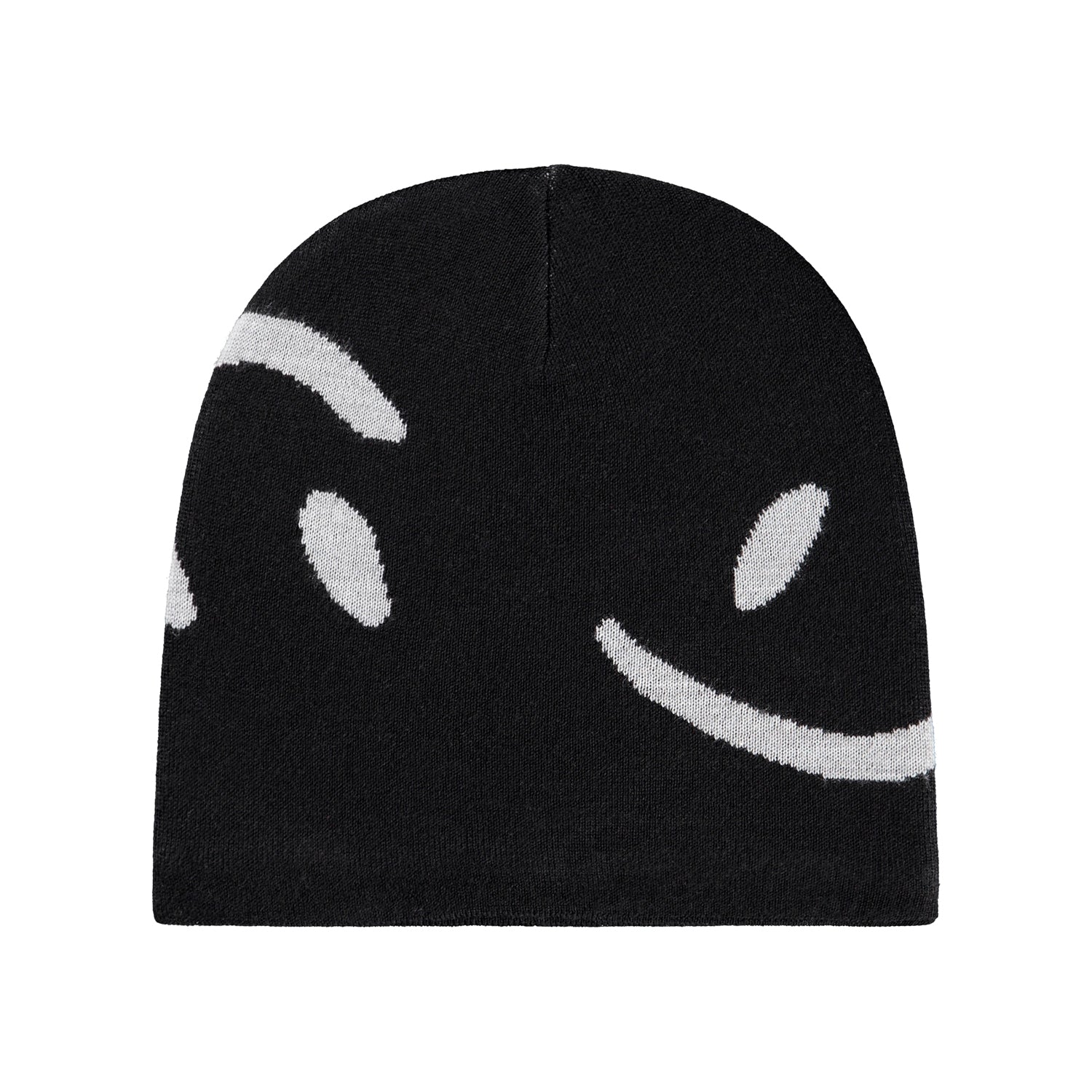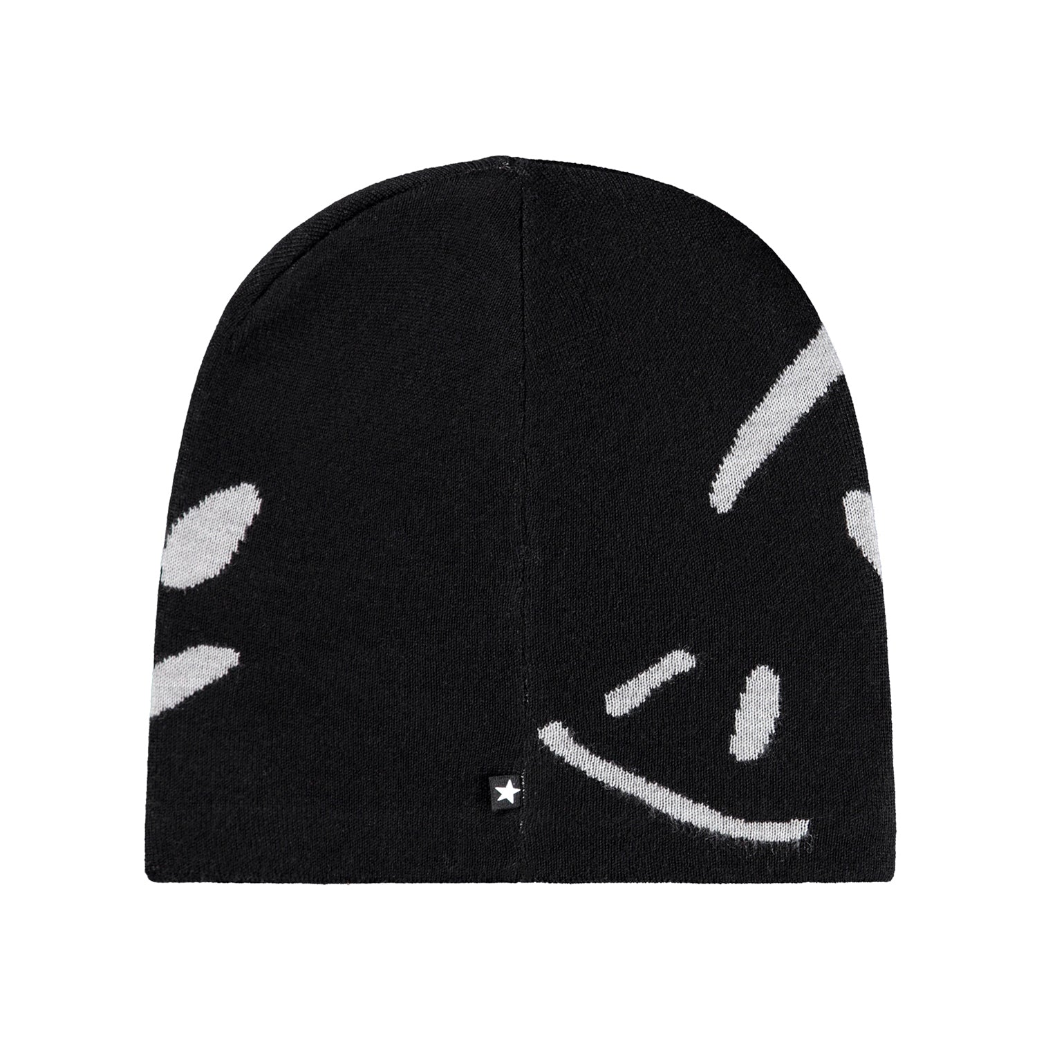 Svört, flísfóðruð ullar húfa frá Molo með broskalla mynstri.