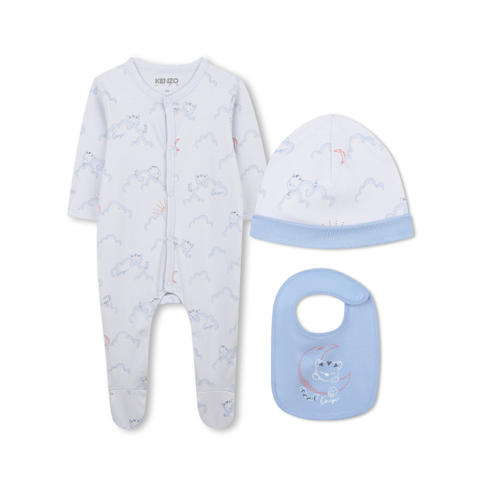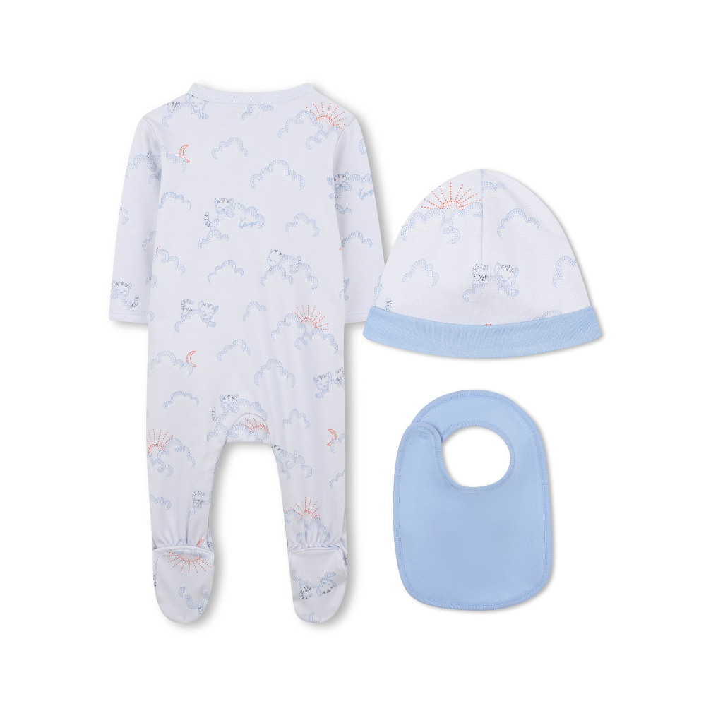 Fallegt ungbarna sett frá Kenzo sem inniheldur mynstraðan heilgalla með áföstum sokkum, húfu og smekk.