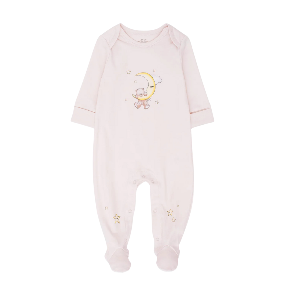 Mjúkur, ljósbleikur heilgalli frá sænska merkinu Livly með fallegri mynd að framan. Gallinn er með áföstum sokkum.