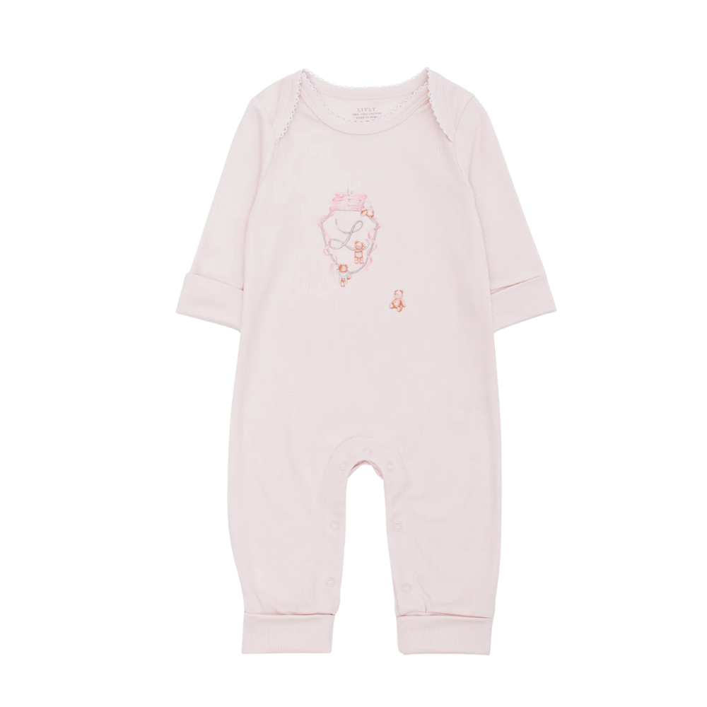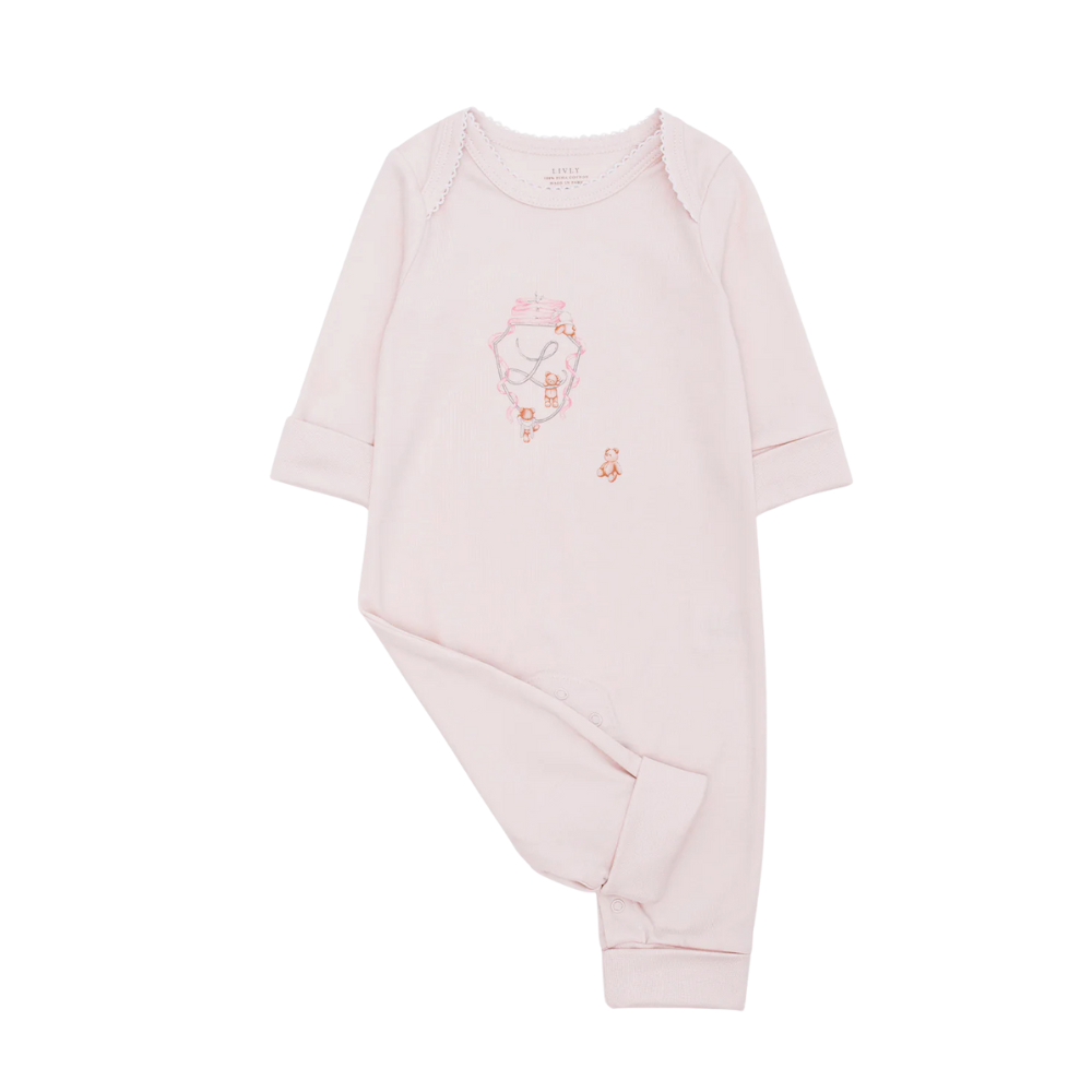 Mjúkur, ljós bleikur heilgalli með fallegri mynd að framan. Galinn er smelltur að framan og með stroffi við ermar og skálmar.