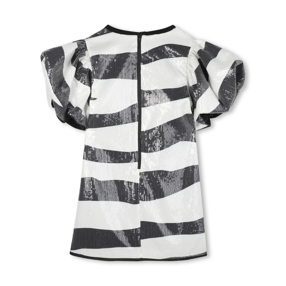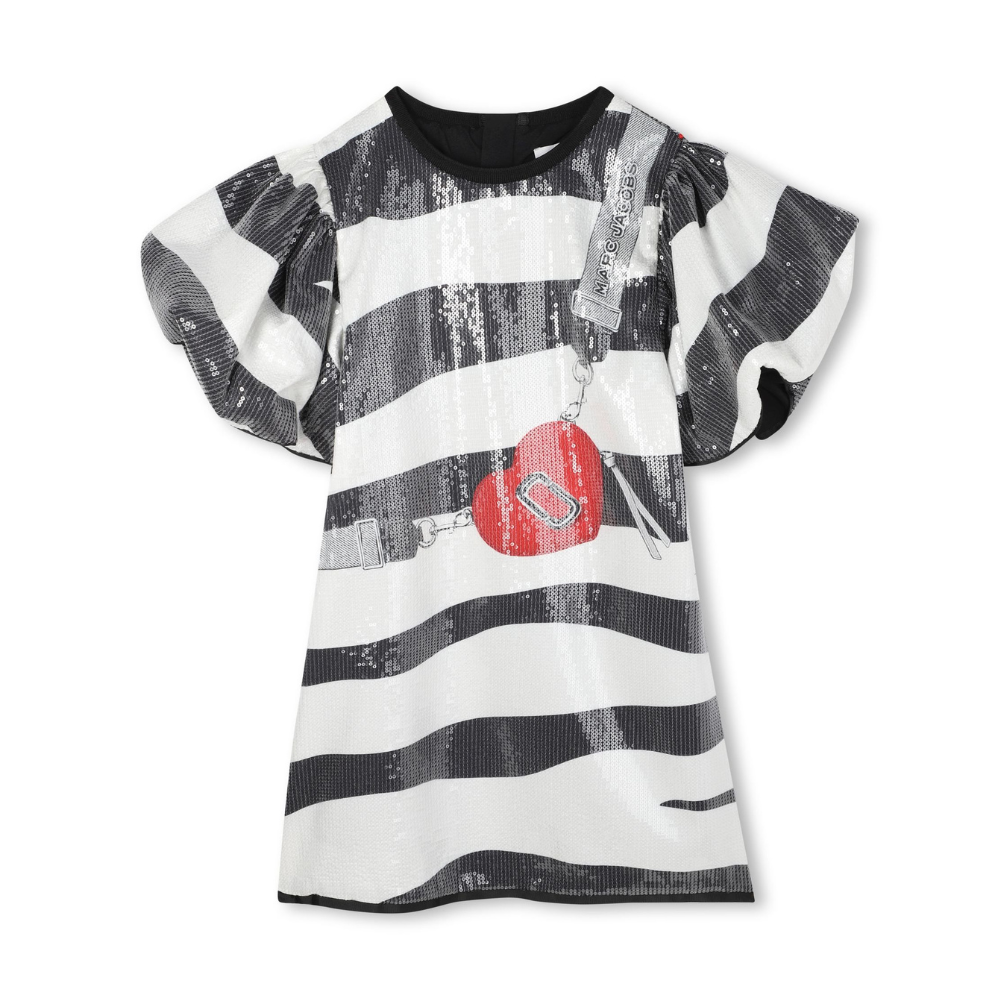 Röndóttur pallíettu kjóll frá lúxushönnuðinum Marc Jacobs. Kjóllinn er með víðum púff ermum og rúnuðu hálsmáli. Kjóllinn er fóðraður og með földum rennilás að aftan.