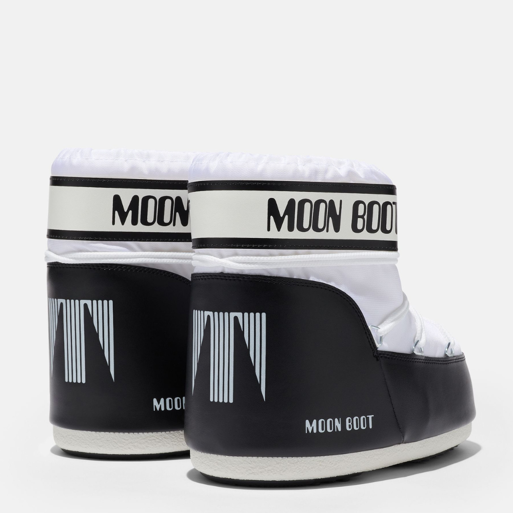 Hvít, lág Moon Boot. Skórnir eru innblásnir af tungl lendingunni 1969 og eru vel einangraðir með léttum millisóla og gripmiklum gúmmí sóla. Skórnir eru fóðraðir með svokölluðu froðufóðri sem hefur verið hannað til að laga sig að fætinum og veitir fullkomin þægindi. Fóðrið býður upp á þann eiginleika að hvert par spannar allt að þrjár stærðir.