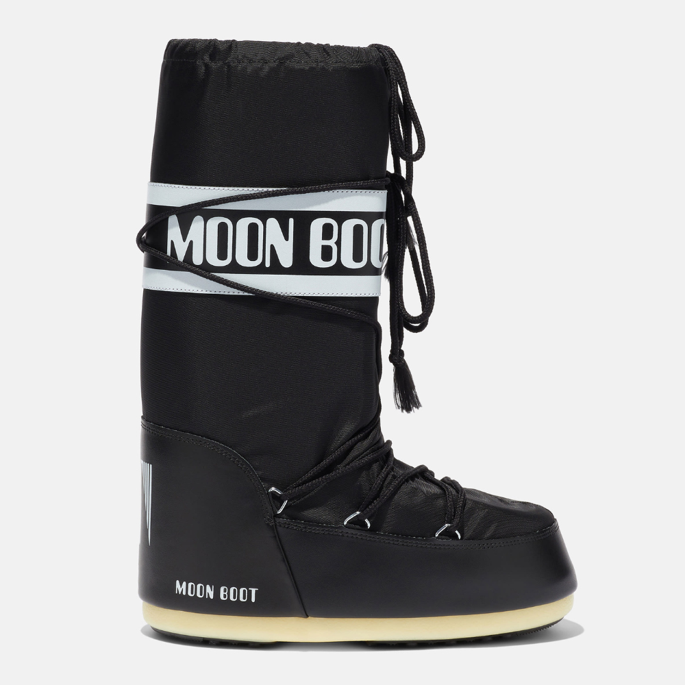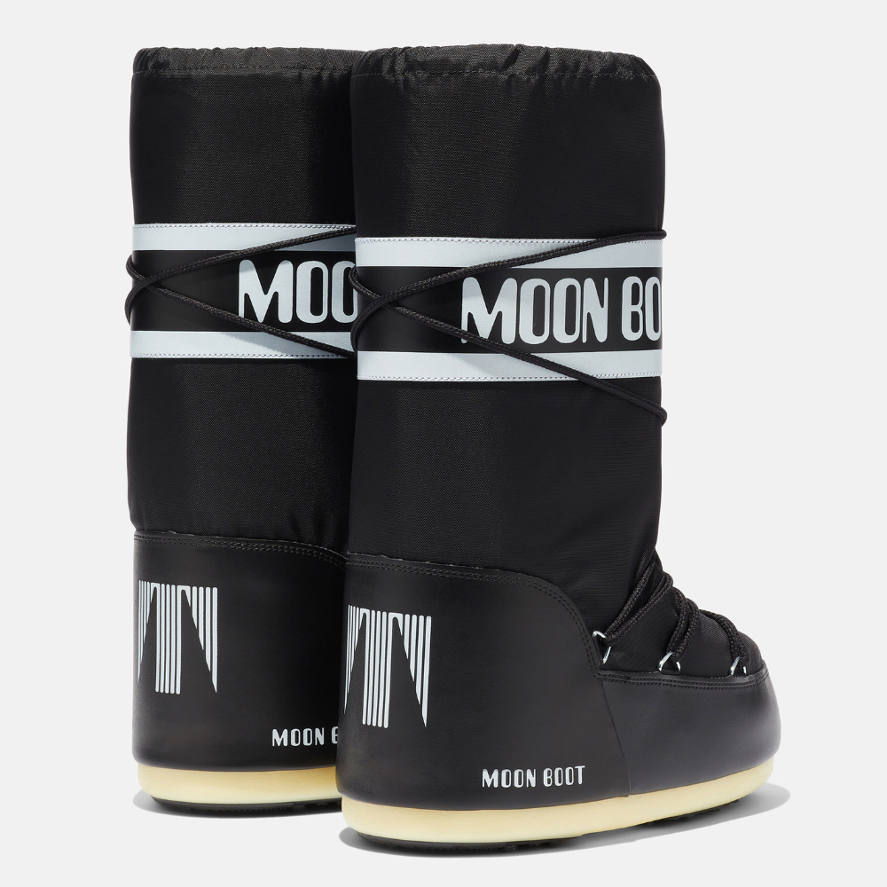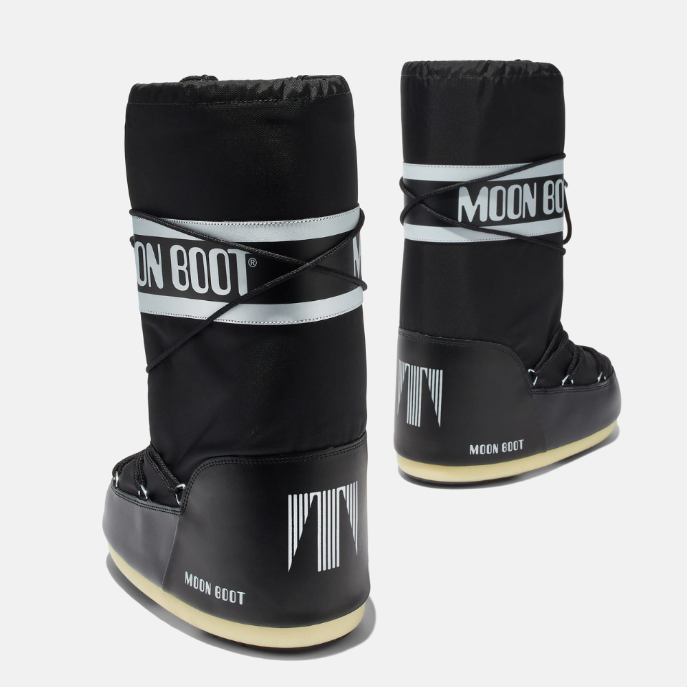 Svört, há Moon Boot. Skórnir eru innblásnir af tungl lendingunni 1969 og eru vel einangraðir með léttum millisóla og gripmiklum gúmmí sóla. Skórnir eru fóðraðir með svokölluðu froðufóðri sem hefur verið hannað til að laga sig að fætinum og veitir fullkomin þægindi. Fóðrið býður upp á þann eiginleika að hvert par spannar allt að þrjár stærðir.