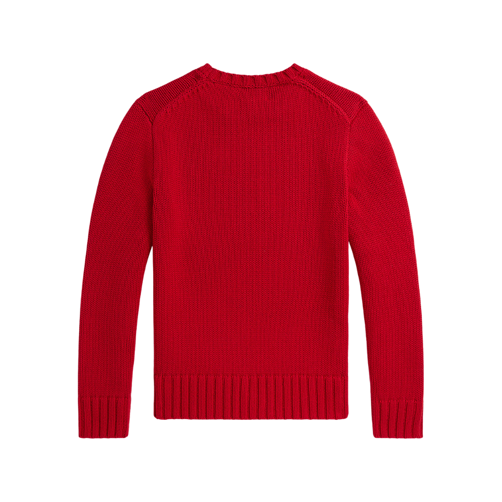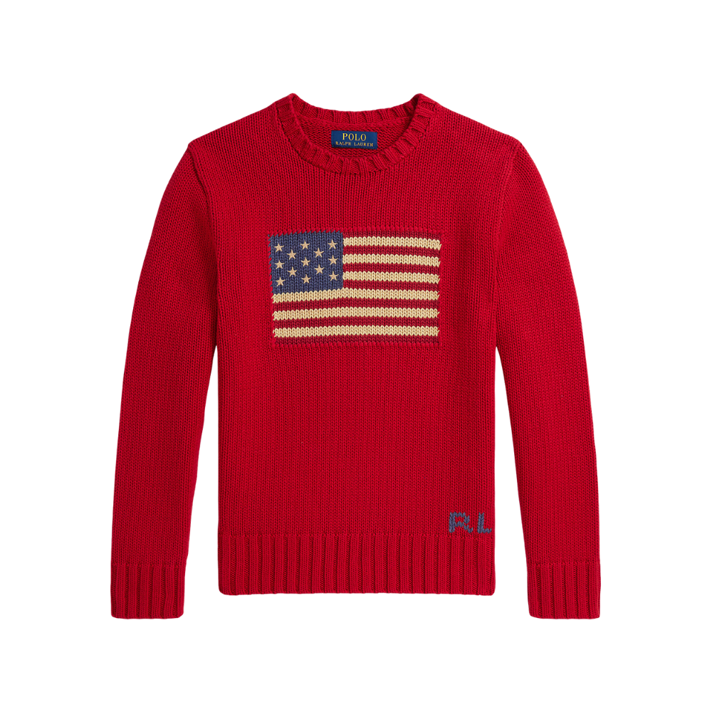 Rauð prjónapeysa frá Polo Ralph Lauren með stórum fána að framan.