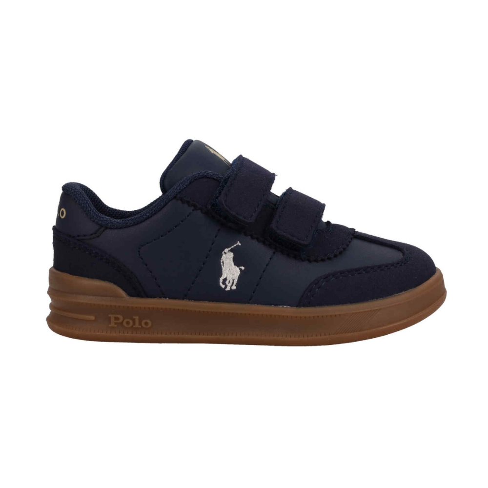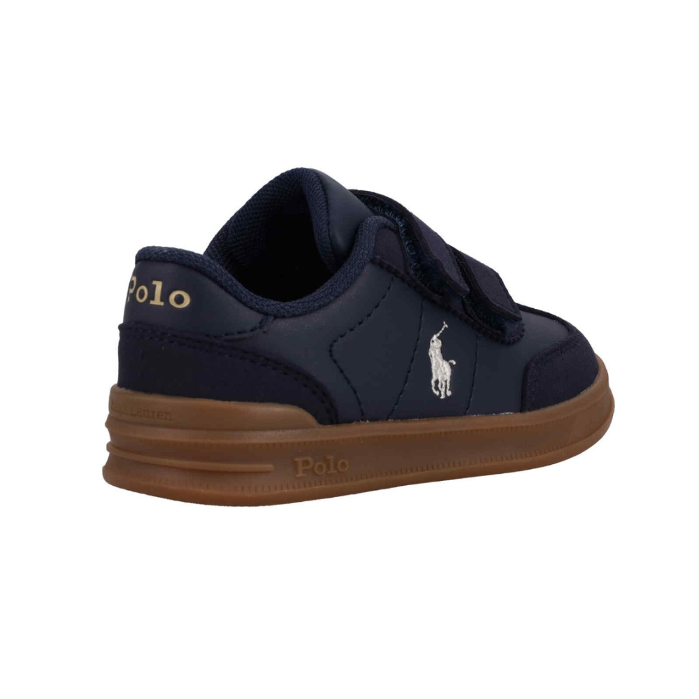 Dökk bláir strigaskór frá Polo Ralph Lauren með hvítu logo á hliðinni og brúnum gúmmísóla.