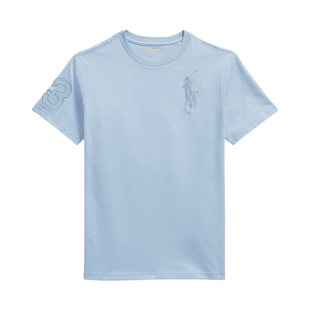 Ljós blár stuttermabolur frá Polo Ralph Lauren með stóru logo vinstra megin að framan og á hægri ermi.