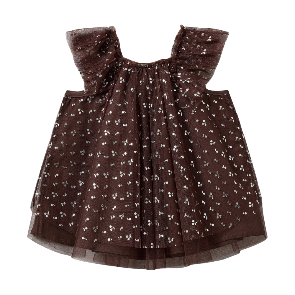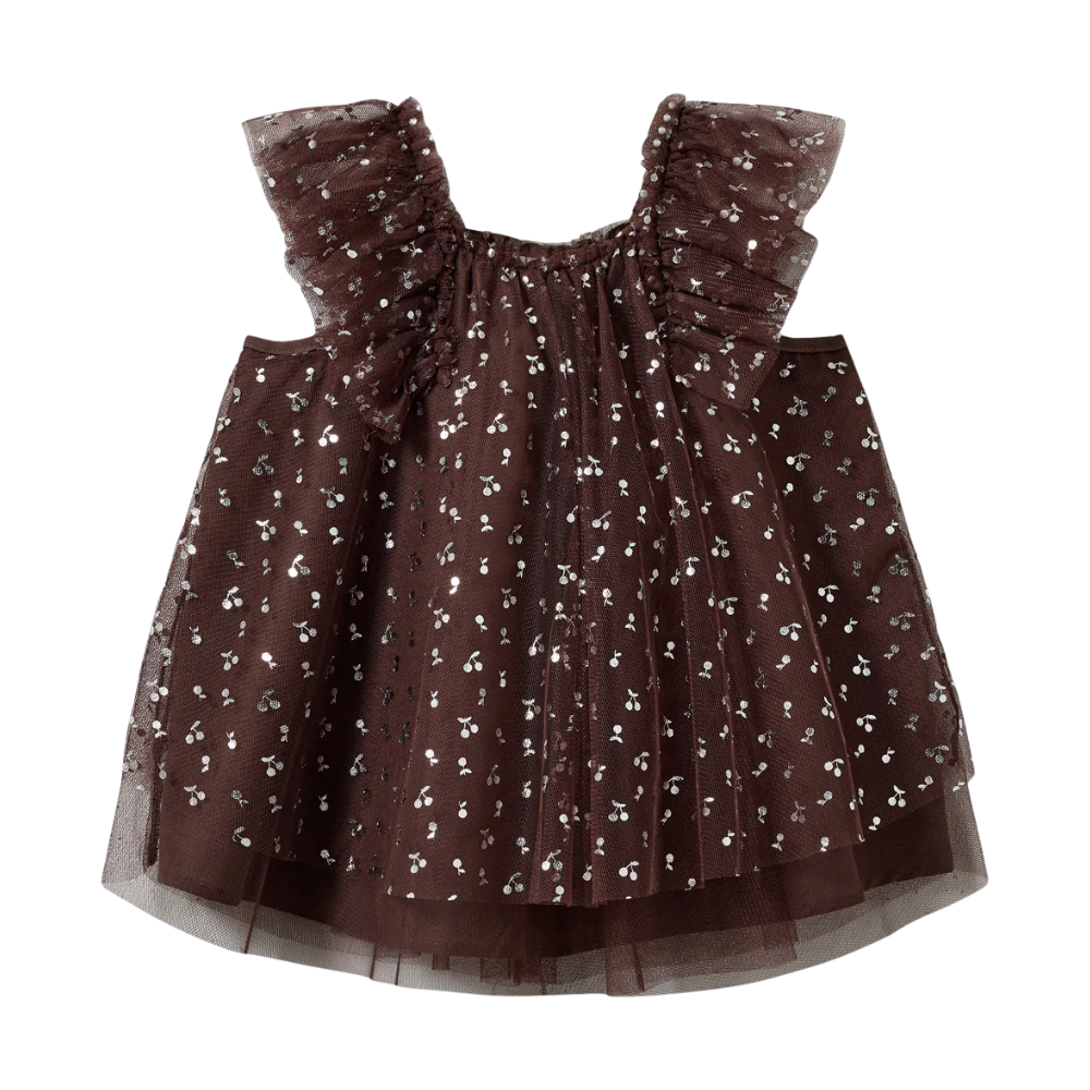Vínrauður, ermalaus kjóll með silfruðu mynstri.