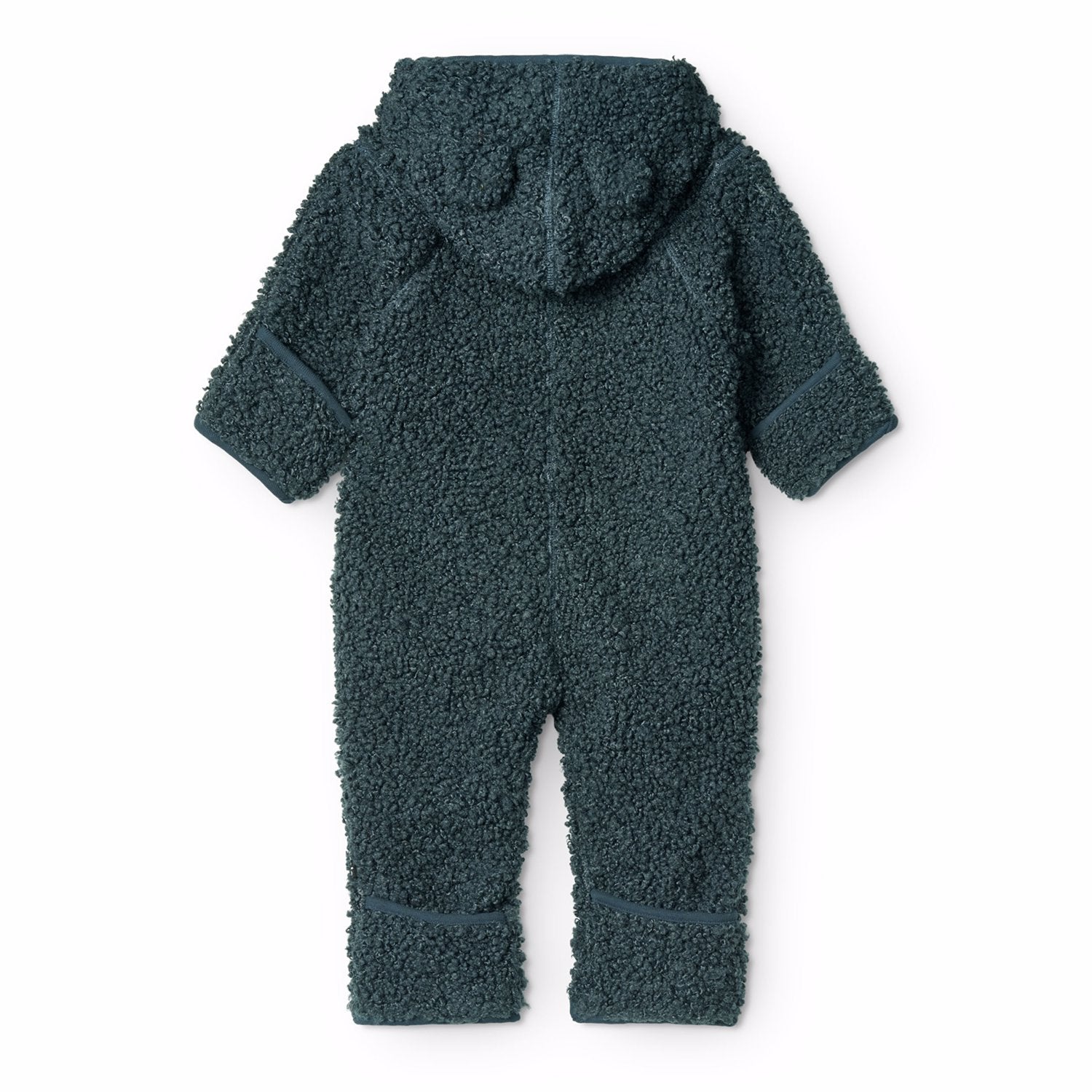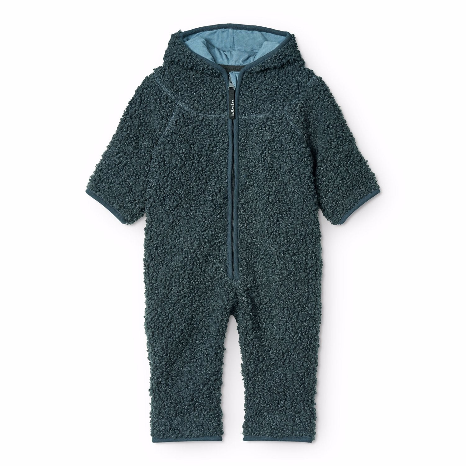 Blár flísgalli með bangsaáferð frá Molo. Gallinn er renndur að framan og með hettu. Hægt að loka fyrir op á ermum og skálmum.