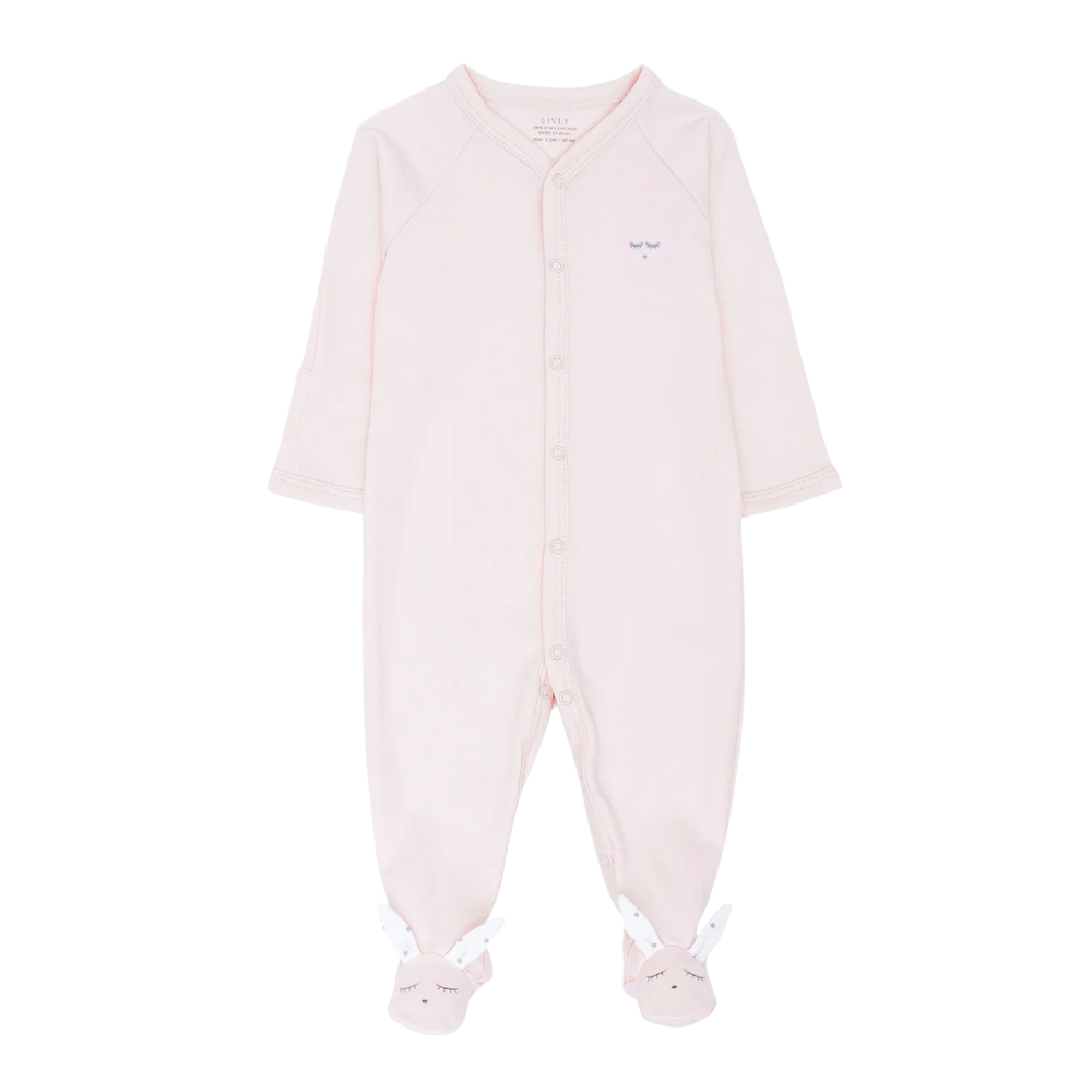 Ljós bleikur, smelltur heilgalli frá Livly með áföstum sokkum með augnlokum og kanínueyrum.