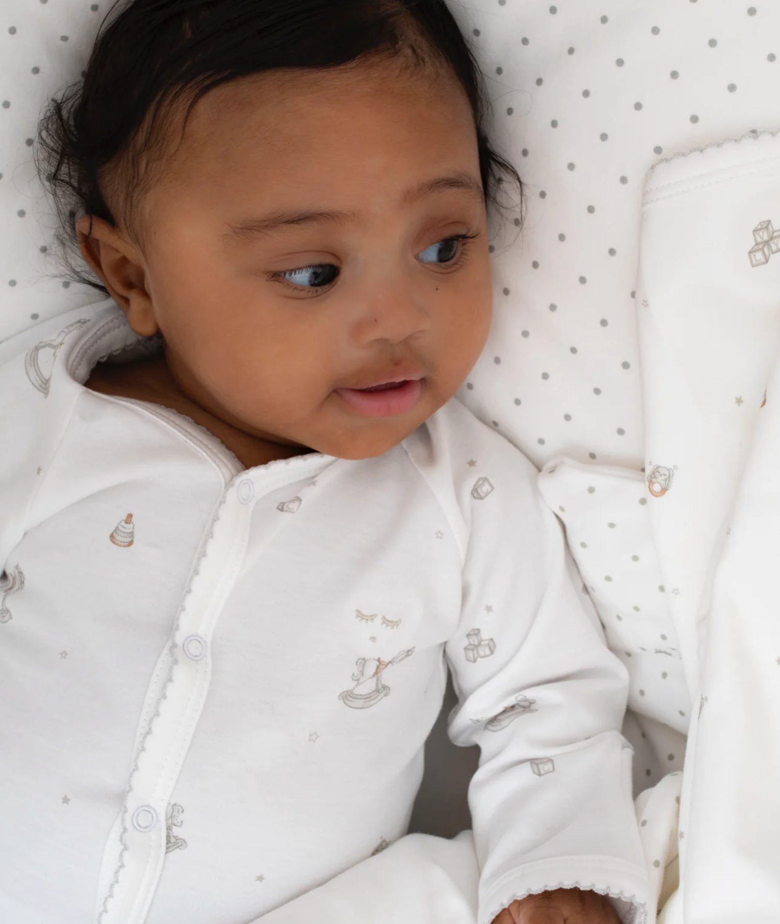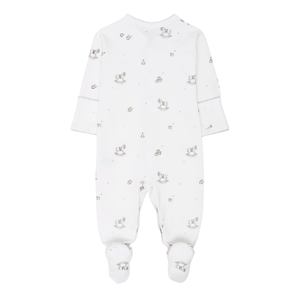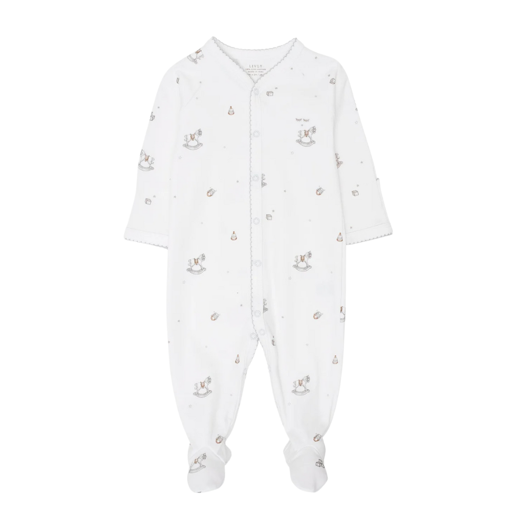 Mjúkur, hvítur heilgalli frá sænska merkinu Livly með fallegu mynstri. Gallinn er smelltur að framan og með áföstum sokkum.