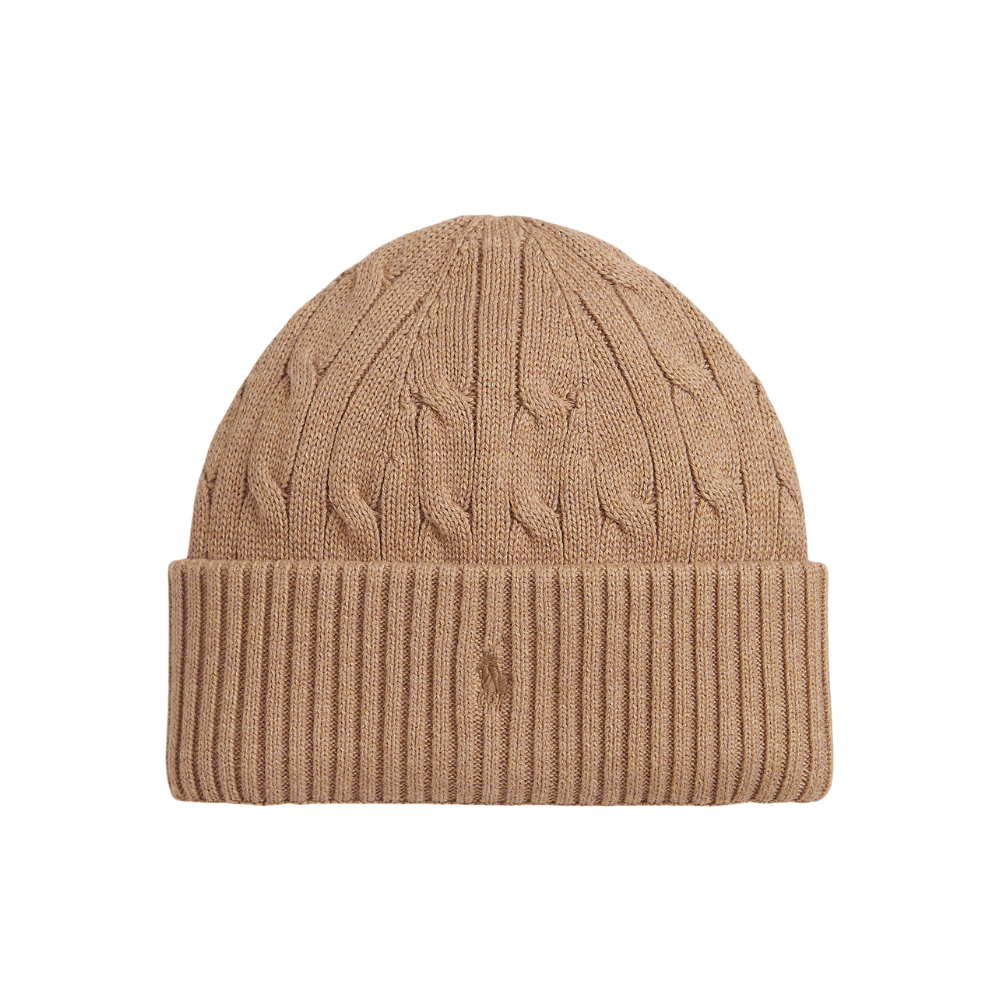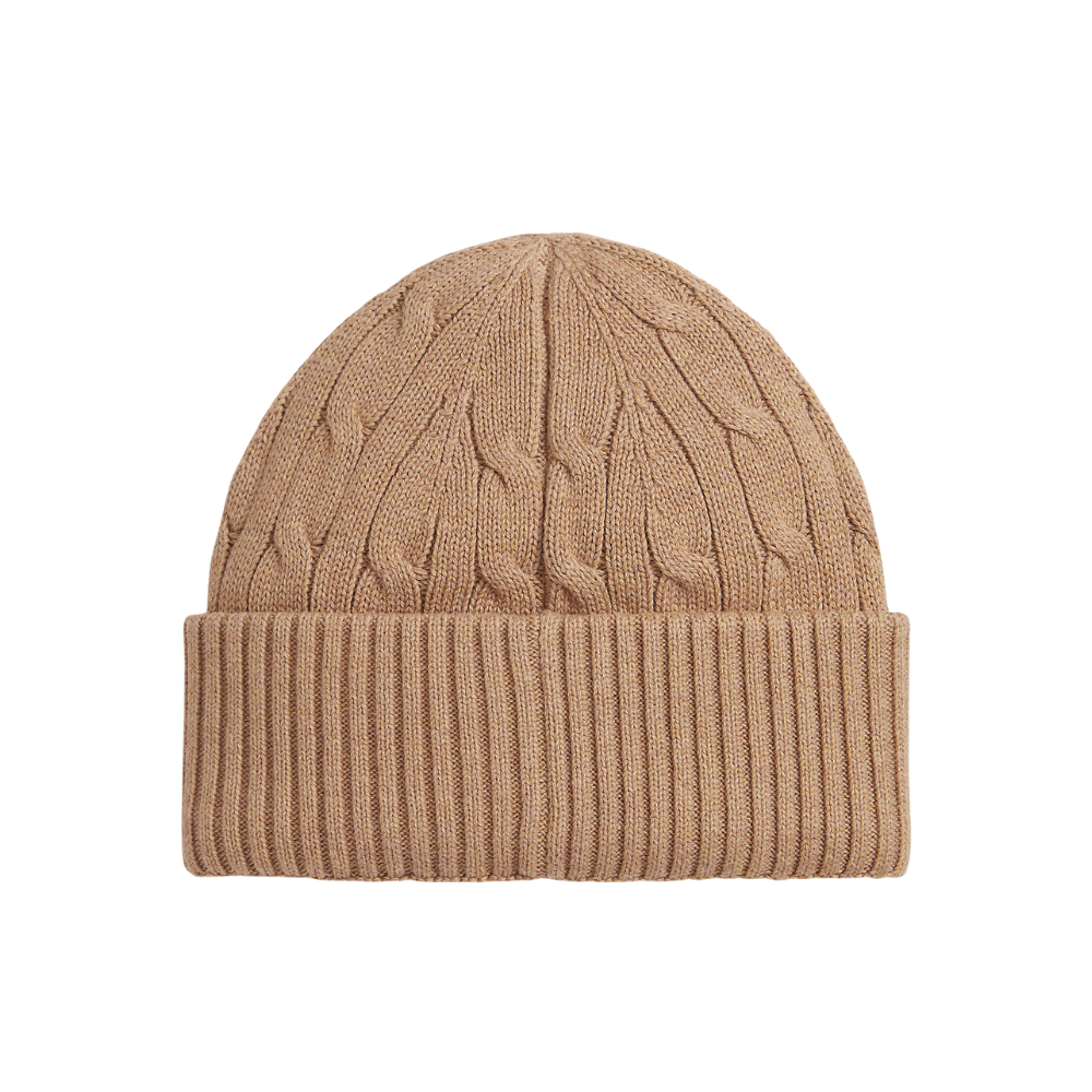 Ljós brún húfa með kaðlamynstri og litlu, útsaumuðu logo að framan.