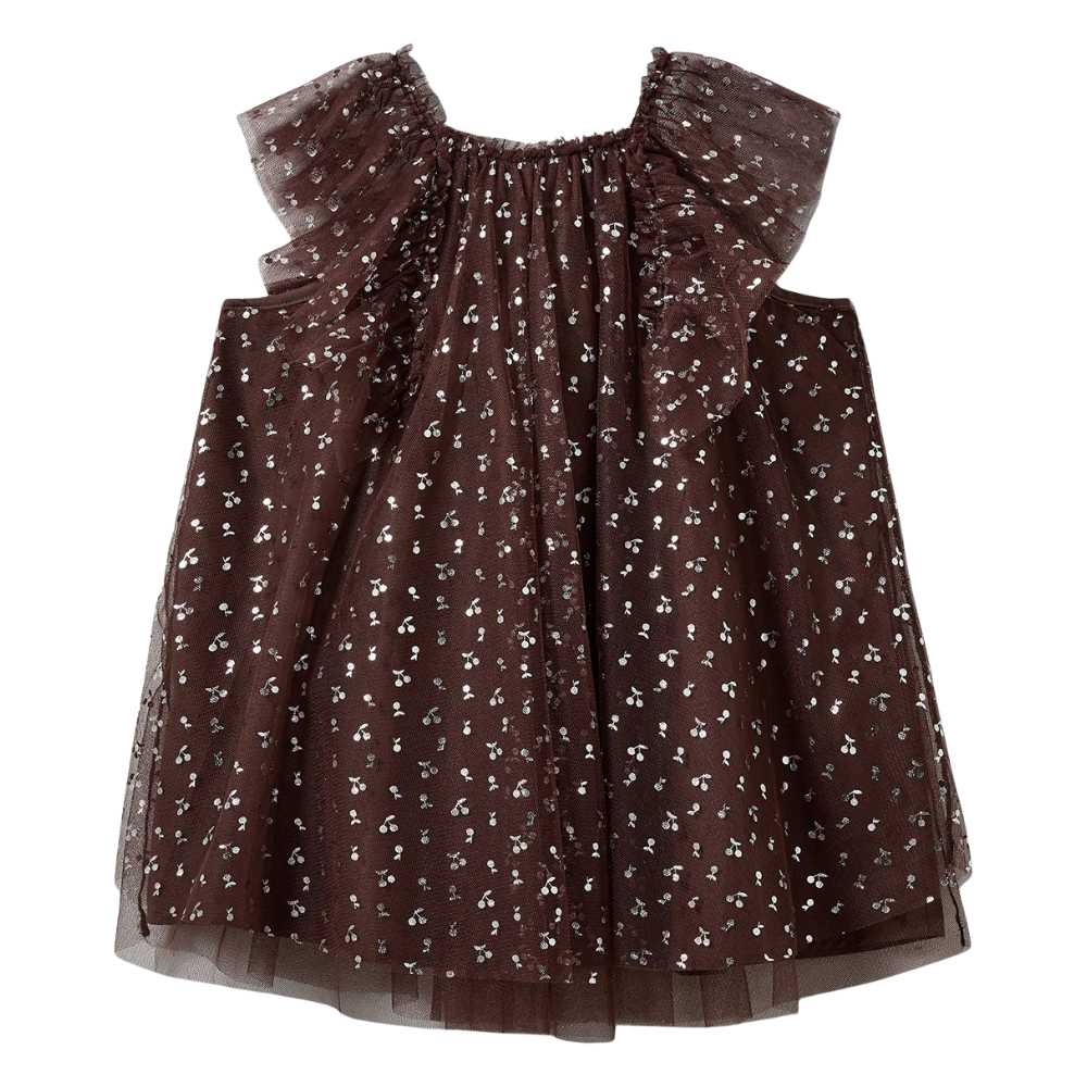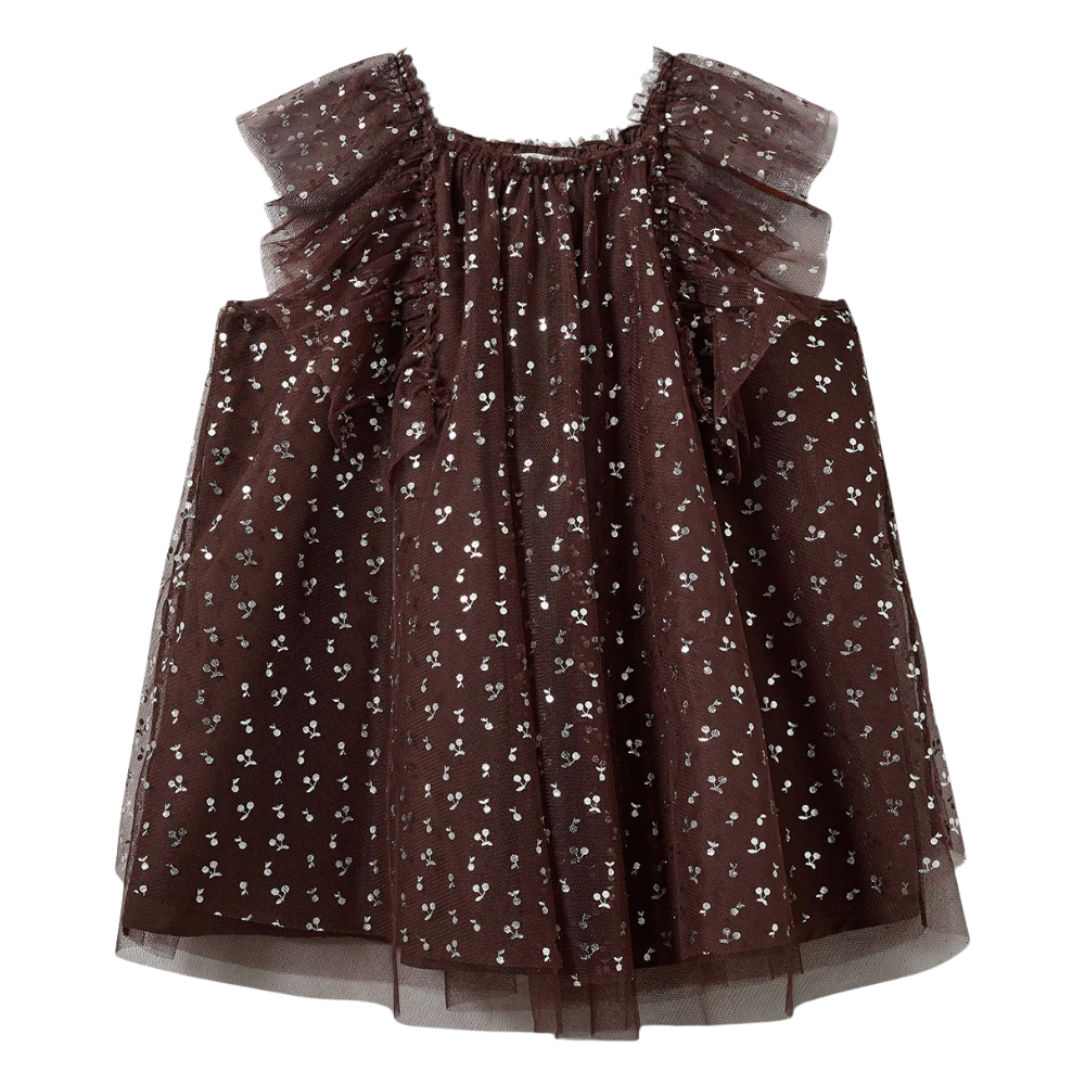 Vínrauður, ermalaus kjóll með silfruðu mynstri.