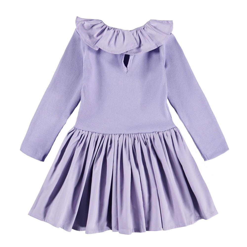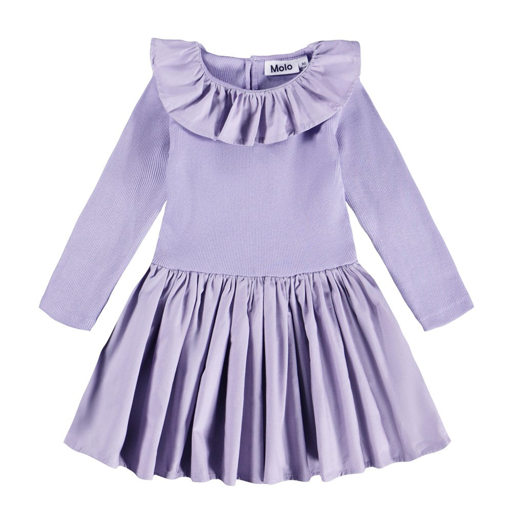 Fallegur, fjólublár Molo kjóll með víðu pilsi og pífukraga.