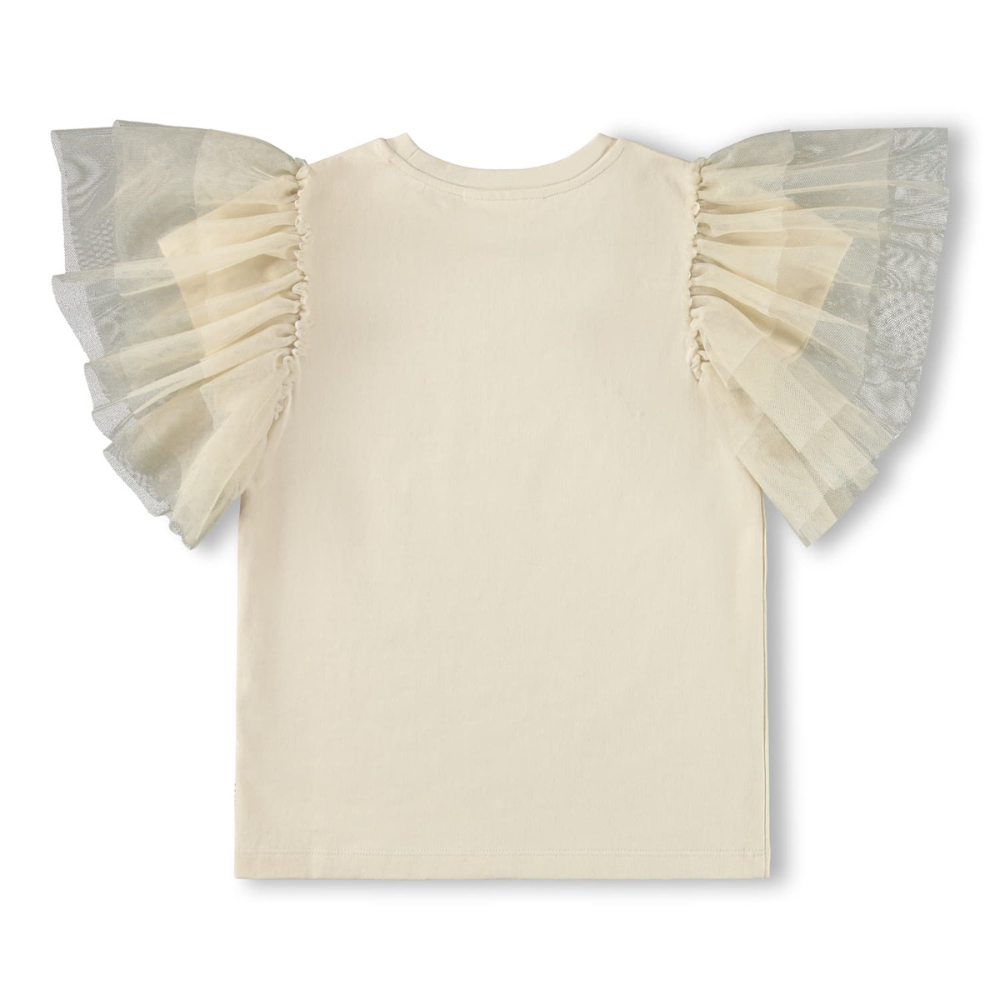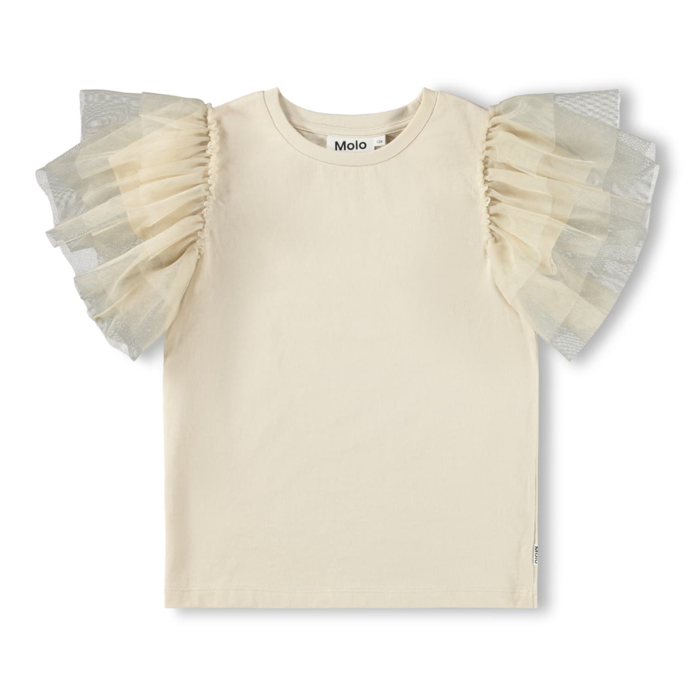 Ljós stuttermabolur með pífuermum.
