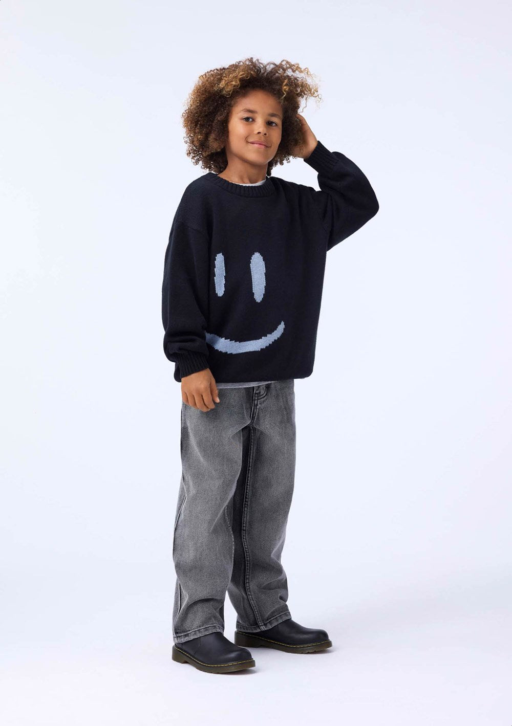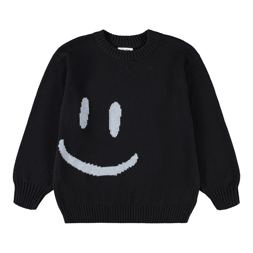 Svört prjónapeysa frá Molo með broskalli að framan og aftan.