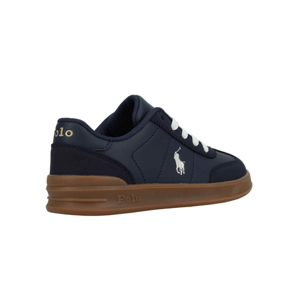 Dökk bláir strigaskór frá Polo Ralph Lauren með hvítu logo á hliðinni og brúnum gúmmísóla.