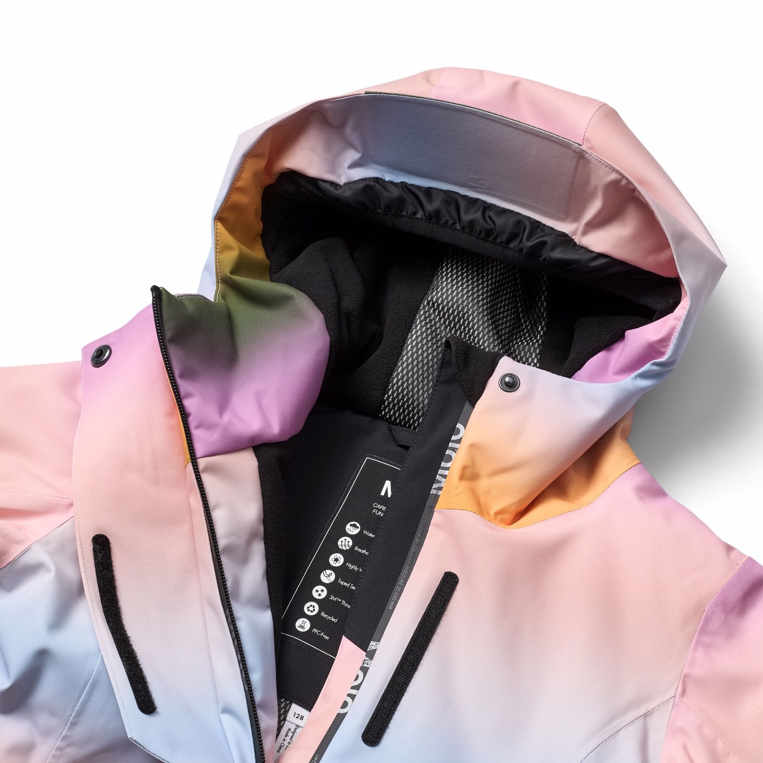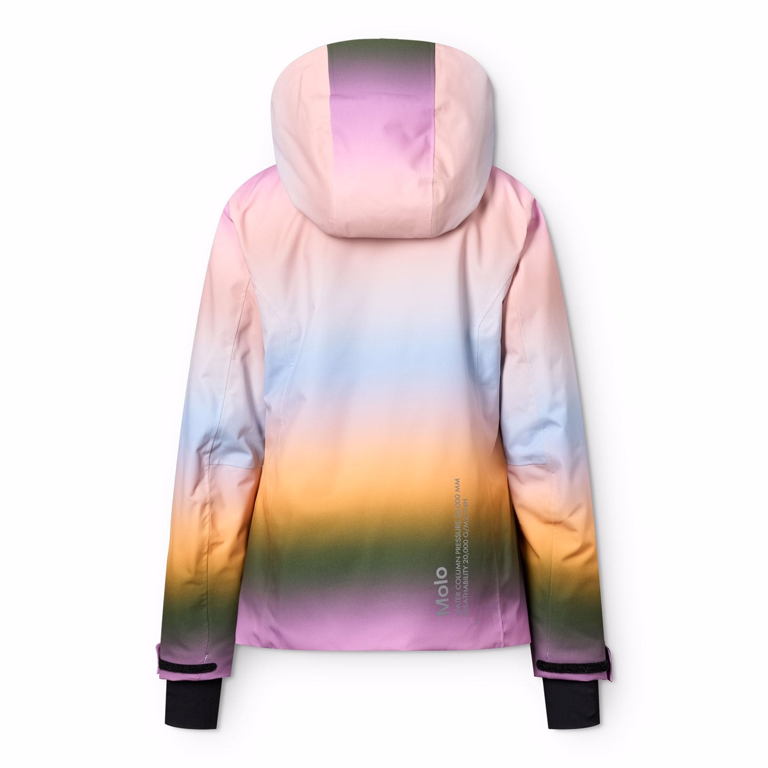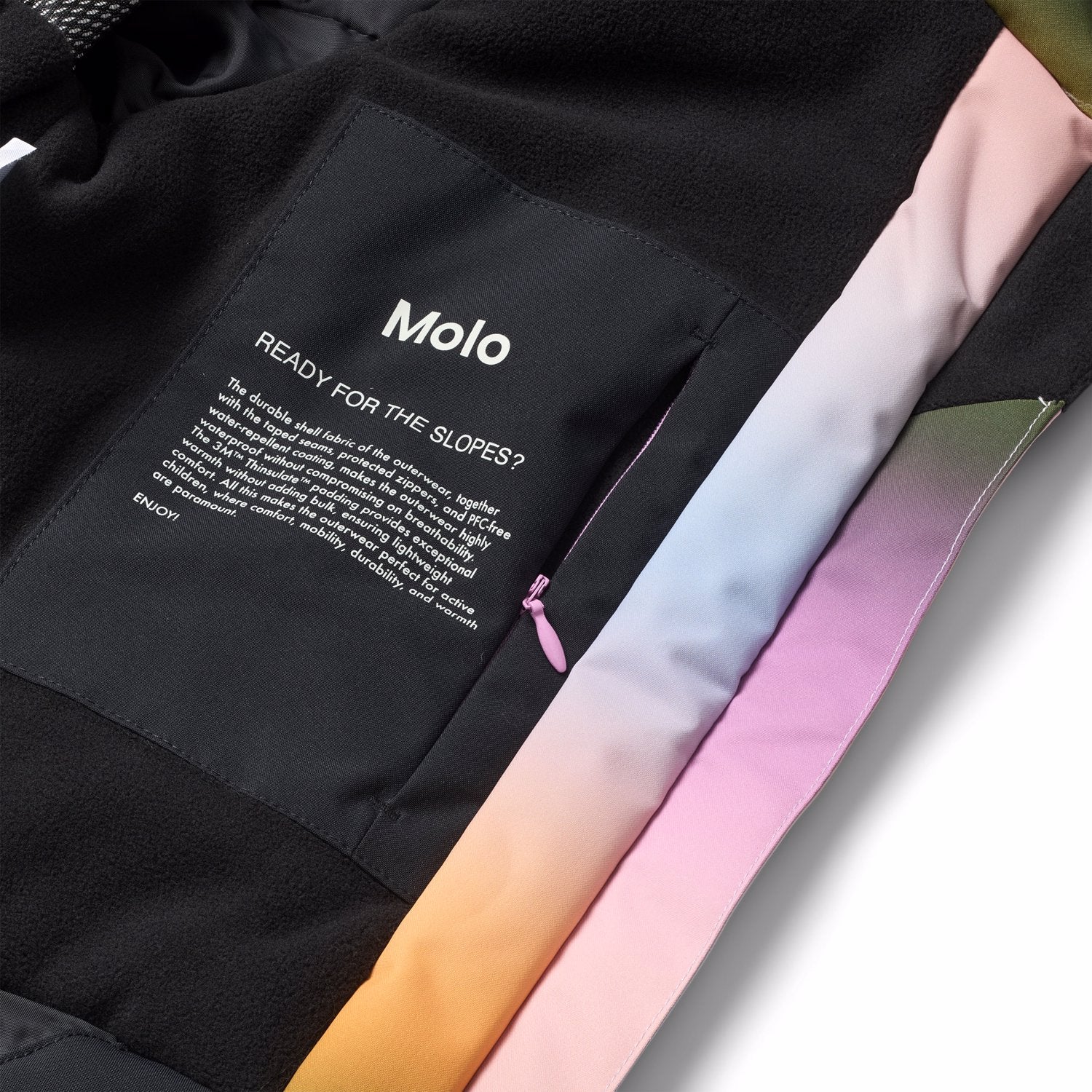Mynstruð skíðaúlpa frá Molo sem veitir góða einangrun. 20.000mm vatnsvörn og 20.000 g/m2/24klst öndun. Saumar eru límdir og allur frágangur er vatnsheldur. Úlpan er með hettu sem hægt er að fjarlægja, rúmgóðum vösum að framan og á ermum. Vindhlíf á ermum með gat fyrir þumalfingur. Sterkir endurskinsborðar og endurskinsmerki gera barnið sýnilegra.