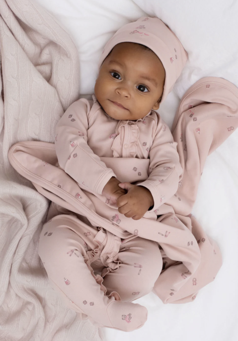 Mjúkur, ljósbleikur heilgalli frá sænska merkinu Livly með fallegri mynd að framan. Gallinn er smelltur að framan og með áföstum sokkum.